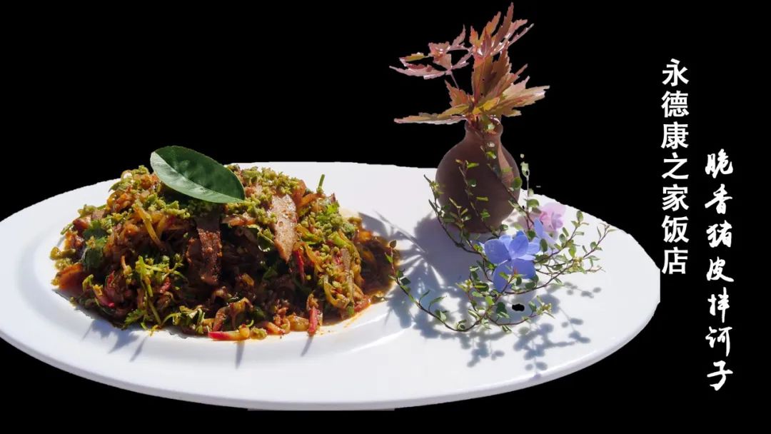 生皮是永德有名的菜着。将整只猪置于松毛或稻草火上烘烤,待烤至半生半熟时,去毛再烤,直至皮肉呈金黄色时为止。生皮鲜嫩可口、满口溢香,感觉不出平时生猪肉片具有的腥味。脆香猪皮拌柯子完美将永德生皮和永德柯子完美结合,入口细腻爽滑,爽脆麻辣、养生滋补,是独具地方特色的药膳美食。