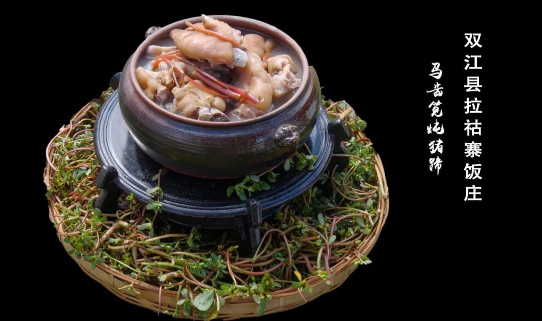 马齿苋炖猪蹄是双江自治县“拉祜寨饭庄”的一道特色药膳。将猪蹄劈开切成小块,马齿苋洗净与猪蹄一同加适量水入锅,小火慢炖至猪蹄熟烂加盐调味即可。马齿苋其味酸涩,猪蹄肉质紧致,两种食材相互中和之后猪蹄肉质软嫩酥滑、肥而不腻口感独特,有活血化瘀、消炎止痛之功效。