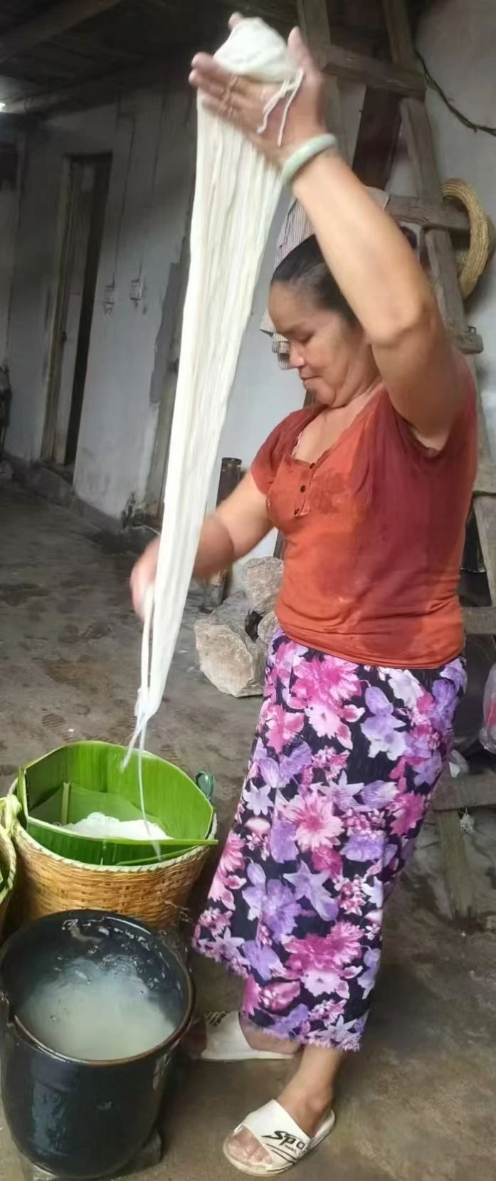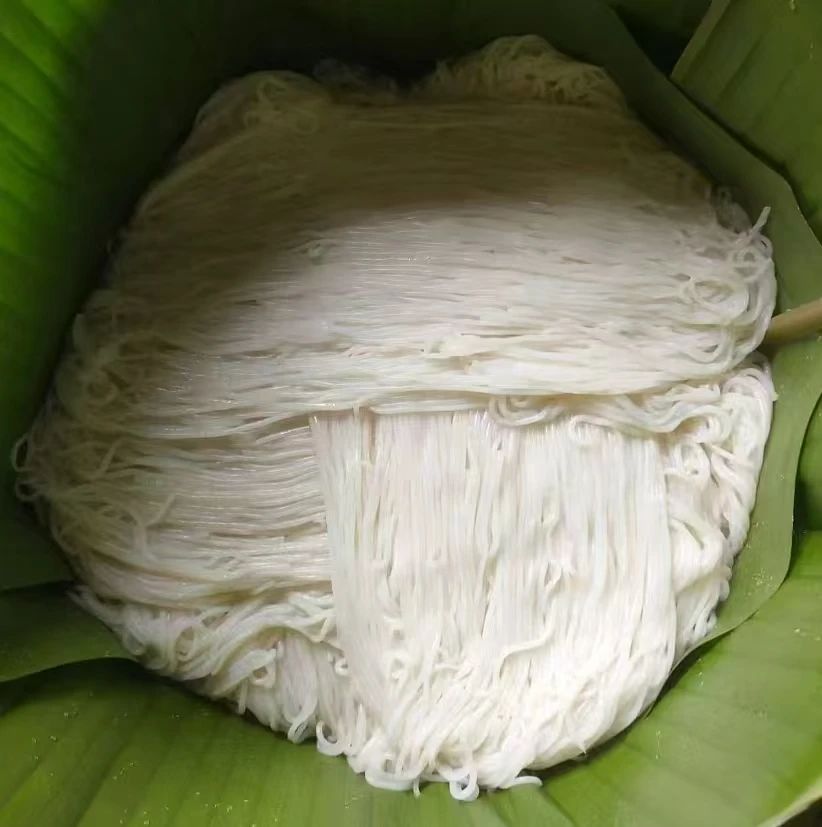 耿马自治县孟定镇遮哈社区老贺岭村民贺岩少介绍:整个制作流程需要4天。第1天,把大米泡软,然后滤干水,放进竹篓里,用芭蕉叶盖住。第2天,用清水冲洗大米,滤干水后盖上芭蕉叶放进竹筐里。第3天,大米充分发酵后,磨成米浆,用纱布包起来,放进竹筐,在上面压上几块大石头,把大米的水分充分压出来。直到第4天,才开始正式制作米线。把刚蒸出过的米团,冷却之后放进机器里沥成米浆。米浆稀释揉匀后,就用纱布过滤,滤完之后就是米线的原浆了。接下来把原浆装入专用的器具中,朝着烧开了水的锅里一边挤一边顺着一个方向旋转,入水后就变成米线了。