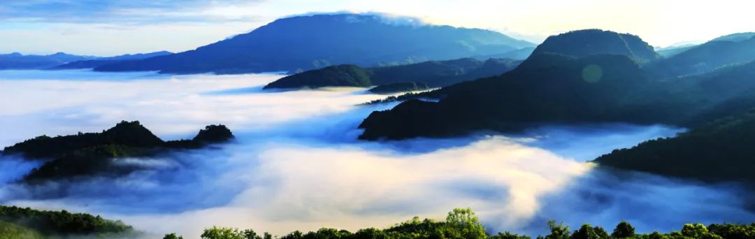 日出前,它像一位身姿婀娜的少女躺在山下,纹丝不动,静如一汪清澈的湖水。早晨太阳冉冉升起,它开始慢慢起伏涌动,像少女舒缓地伸展手臂,任轻风舞弄着长裙。太阳出来后,云海变得绚丽多姿。开阔的地方,如激浪翻滚的波涛,狭窄的隘口,若飘逸晃动的白练。一些峰尖刺破云层,突兀矗立于苍穹,像春笋出土,一个个小山帽游离于云海半截的山腰,像小舢板,荡漾于云海波涛之中。时近中午,气温升高,这时云层开始急剧地翻滚、奔涌、群山、云海时隐时现,极目之处,气象万千。