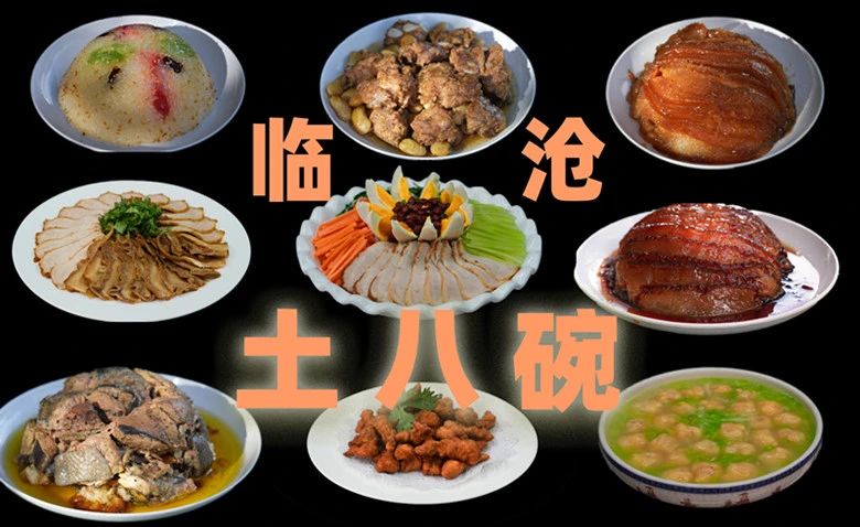 临沧土八碗又名八大碗,一般由凉米线、糯米鸡、千张肉、粉蒸肉、大白豆蒸排骨、八宝饭、炸酥肉、煮圆子共八道菜组成,是临沧地区婚宴当家菜。不同的菜代表着浓厚的地方文化,也有着很深的人生寓意。
