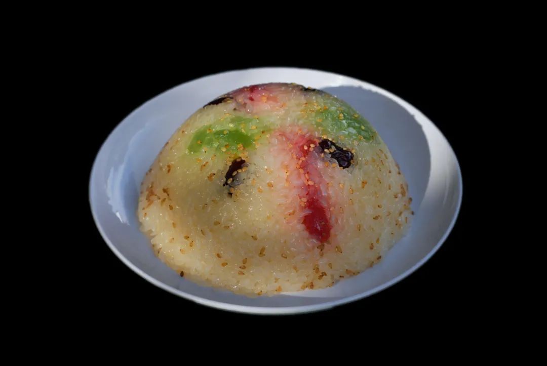 八宝饭由糯米、豆沙、红枣、莲子等多种食材蒸制而成,口感软糯香甜,寓意吉祥如意、团圆美满。