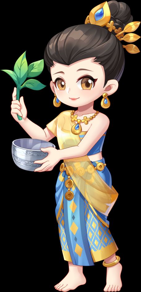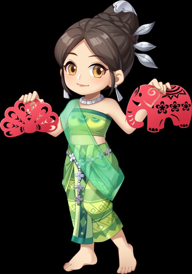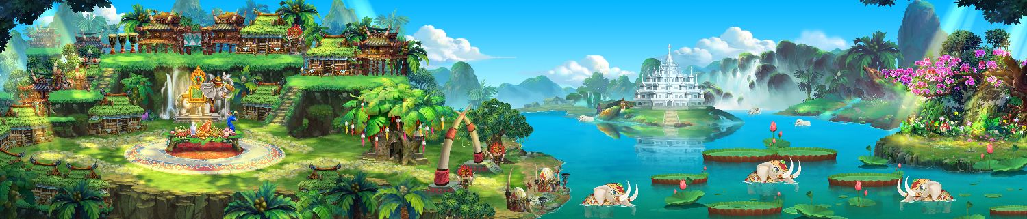 The tree-wrapped pagoda on the left side of the map is inspired by the local scenic spot of Dehong,while the white pagoda on the right side is based on the silver pagoda in Mangshi.You can celebrate the Water-Splashing Festival together on the royal lotus in front of the silver pagoda,where the elephants and people in costumes are splashing water happily.