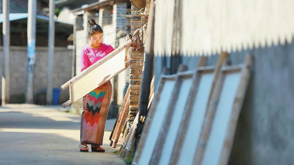 艾叶是傣家家族造纸第九代传承人,也是党员致富带头人、临沧市“百名大师”、临沧市非物质文化遗产代表性传承人和“全国乡村振兴青年先锋”。2014年6月,她成立临沧孟定芒团傣影手工艺术有限公司,吸纳造纸户为公司员工。在村党组织的支持下,艾叶探索“党支部+公司+合作社+造纸户”的联农带农模式,大力发展手工白棉纸产业,带动群众增收致富。“白棉纸生态环保,具有韧性好、透气、保存久的特点,如今用于特色剪纸、银行纸币捆扎、茶叶包装、写字作画等,大大增加了造纸户的收入。”今年70岁的芒团村村民、云南省非物质文化遗产代表性传承人引弄边捣纸浆边说。