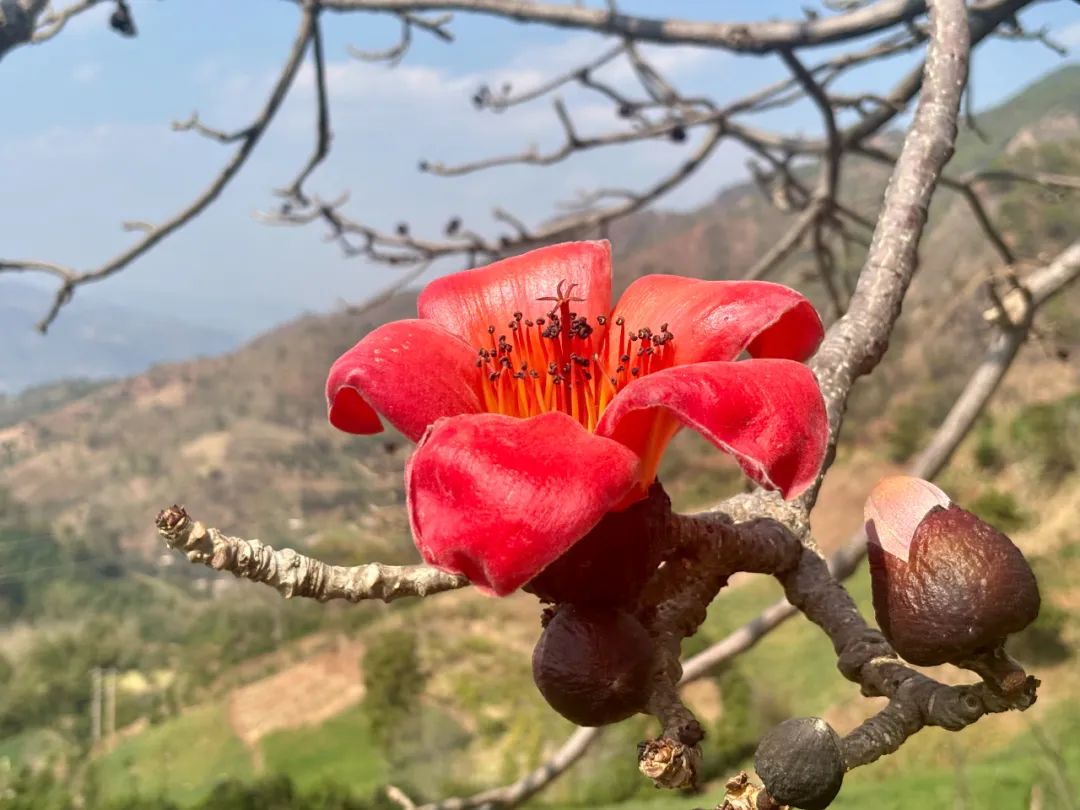 木棉花的花朵,是这场盛宴的主角。它们红得浓烈,红得纯粹,满树繁花似烈火燃烧,将山峦装点得分外艳丽。花瓣层层叠叠,紧密相依,每一片都饱含着生命的张力。花蕊呈金黄色,与艳红的花瓣相互映衬,恰似镶嵌在红丝绒上的金丝,高贵而典雅。
