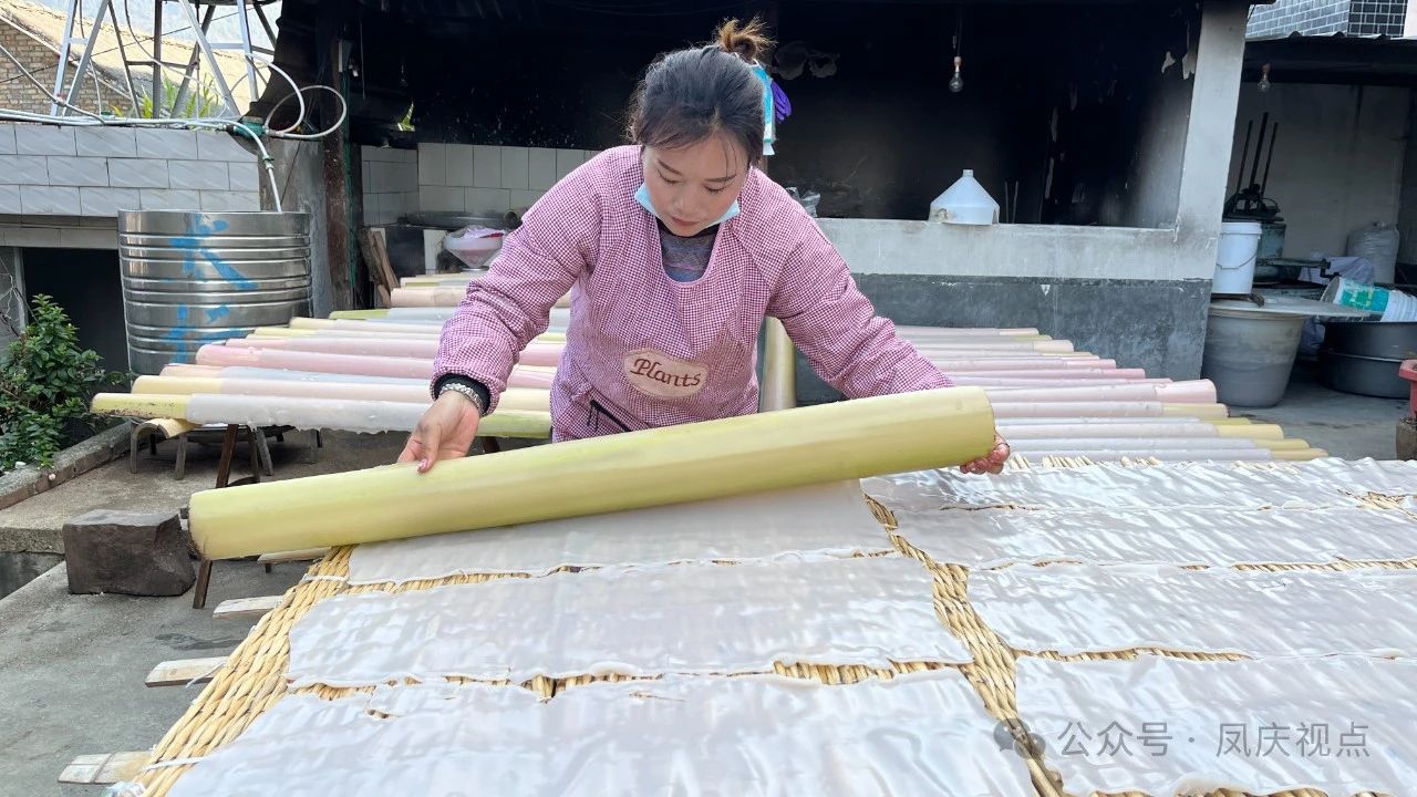 荞干片是腰街乡土特产之一,含有丰富的蛋白质、膳食纤维、烟酸、钙、镁、铁、钾等矿物质,具有爽口、筋道、耐煮等特征,可热炒、油炸、凉拌、煮汤,是逢年过节、婚丧嫁娶不可或缺的美味佳肴。制作过程中要先将荞子打磨成浆,用滤布过滤,分离出芡,再用传统的柴火锅细熬慢煮,直至黏稠后再将热气腾腾的荞粉倒入芭蕉树筒制作的模具中,最后再从模具中小心翻晒在竹笆上暴晒,直到它完全干透。制作过程是繁琐的,但只有这样,才能制作出色泽金黄、口感脆爽的荞干片。而作为88年出生的毕贤书之所以会这门手艺也是为了能养家糊口。