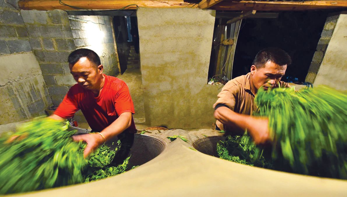 采摘的鲜叶需经过摊放,让茶叶自然失水,散发青草气。杀青时,采用传统的手工杀青方式,在铁锅中快速翻炒,使茶叶受热均匀,杀匀杀透。