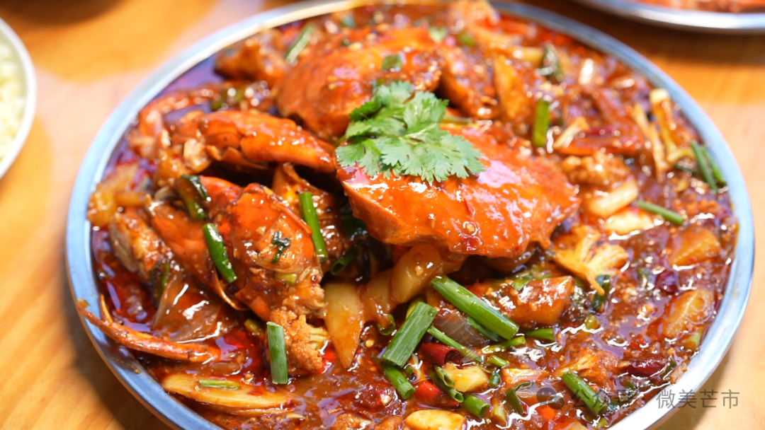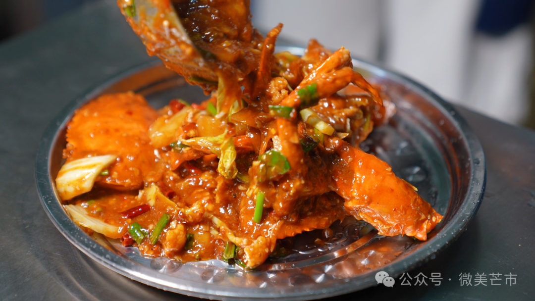 厨师们将刚清洗好的新鲜缅甸青蟹对半切开,入锅与各类调料爆炒,香气瞬间弥漫整条街道。这口从印度洋“远道而来”的鲜味与当地的傣味爆炒碰撞出奇妙的味蕾体验,成为芒市这座中缅边境小城的特色美食之一。
