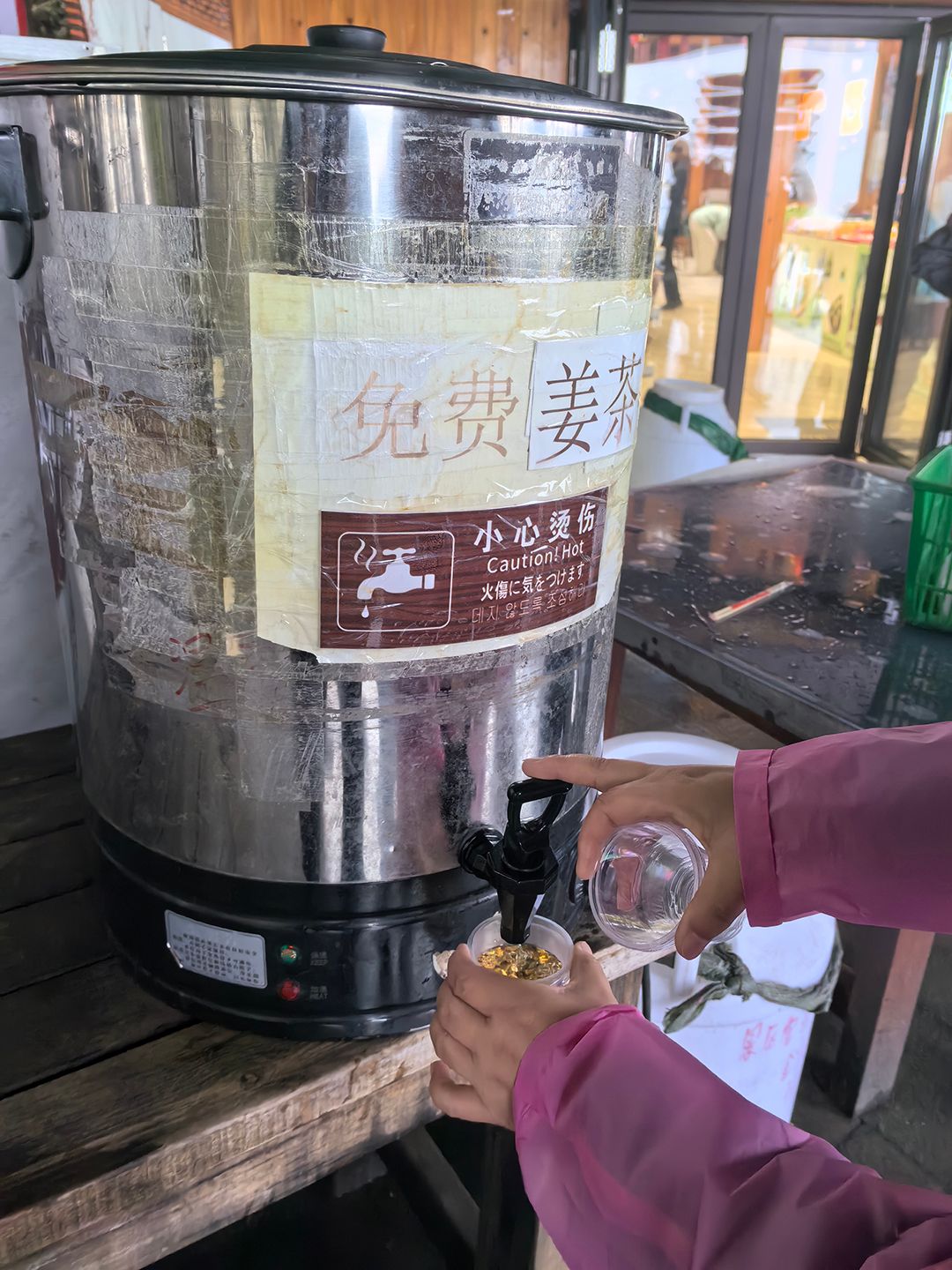 秋日的梵净山烟雨朦胧,海拔带来的寒意夹杂着水汽,让不少身着单薄的游客不禁加快了脚步。此时,在海拔2300米的观景台上,一个不锈钢保温桶,成为了众游客们簇拥着的焦点——桶身上“免费姜茶”四个大字格外醒目,旁边整齐码放着一摞一次性水杯,温馨提示牌上“小心烫伤”让人会心一笑。