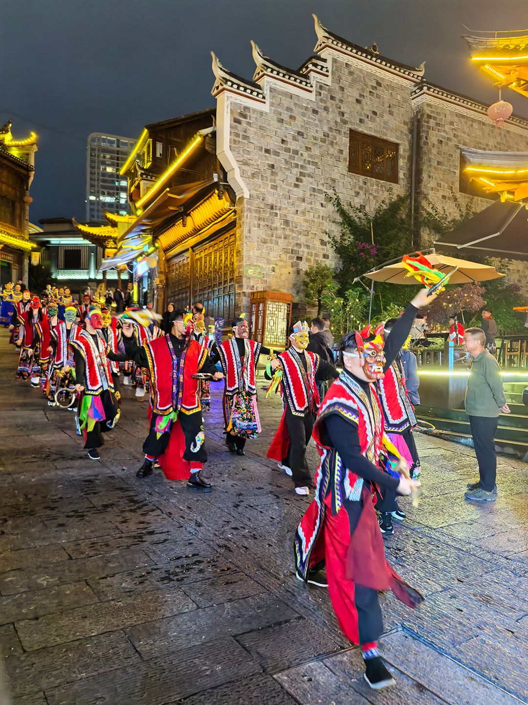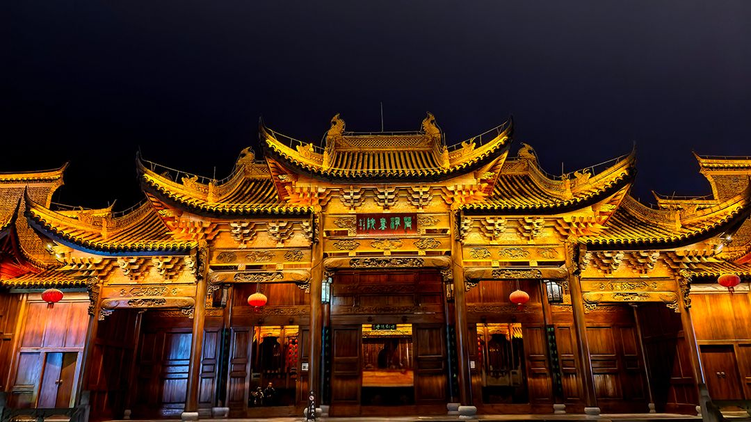古街巷,喧嚣与烟火气便扑面而来,热闹的非遗巡游正穿街而过,傩戏面具神秘古朴,花灯舞步摇曳生姿;江面上,游客们乘着“龙游锦江”的客船在墨色的水面上行过,两岸的明清古建被灯光勾勒出飞檐翘角的轮廓,倒映在水中,随波光碎成万千金鳞;转角处一方露天广场,手捧一杯热茶,或是一杯新鲜冲调的抹茶,坐在长凳上,任凭巷子外的欢声笑语与眼前的旧时光交织,感受一种奇妙的闲适……