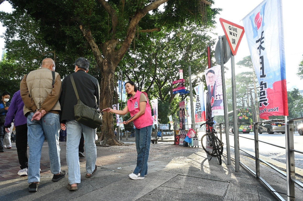 11月22日,香港特区2025年立法会换届选举的宣传活动持续进行。香港天后街头有工作人员派发介绍候选人的宣传单。 中新社记者李志华 摄