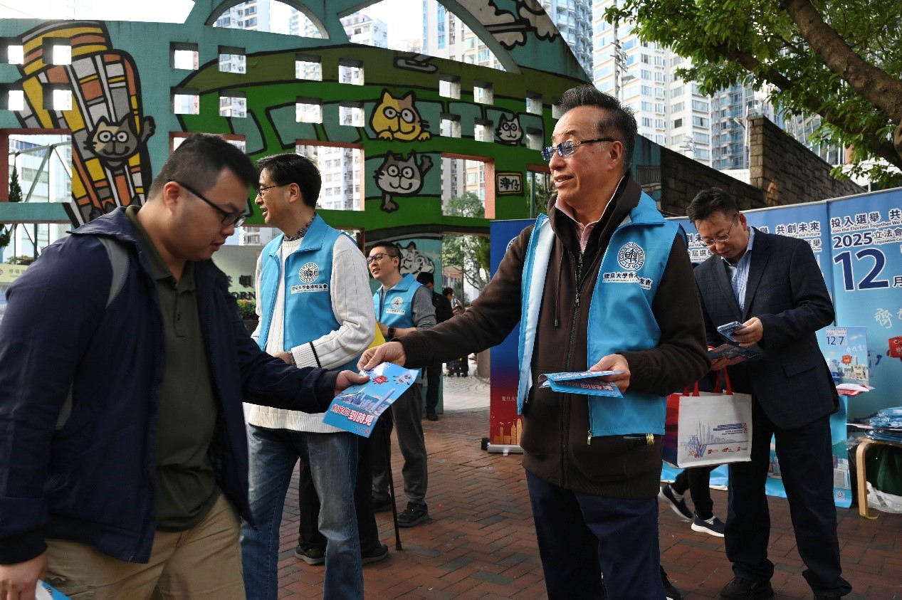 11月22日,全国政协港澳台侨委员会副主任屠海鸣联同复旦大学香港校友会成员,在香港岛湾仔区一个街站上派发宣传单,呼吁选民在2025年立法会换届选举投票日投票。图为屠海鸣(右二)向市民派发立法会换届选举宣传单。 中新社记者李志华 摄