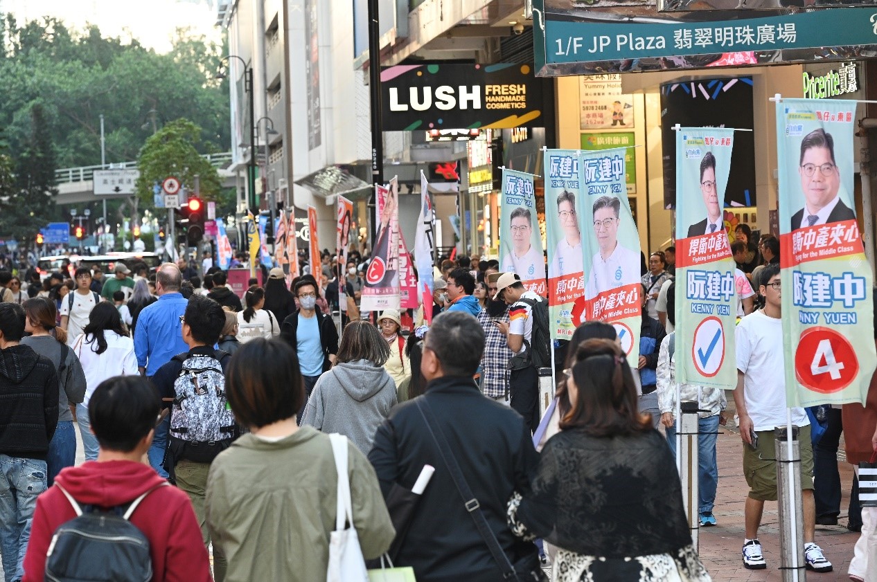 11月22日,香港铜锣湾街头布置了大量2025年立法会换届选举的宣传品,气氛浓厚。 中新社记者李志华 摄