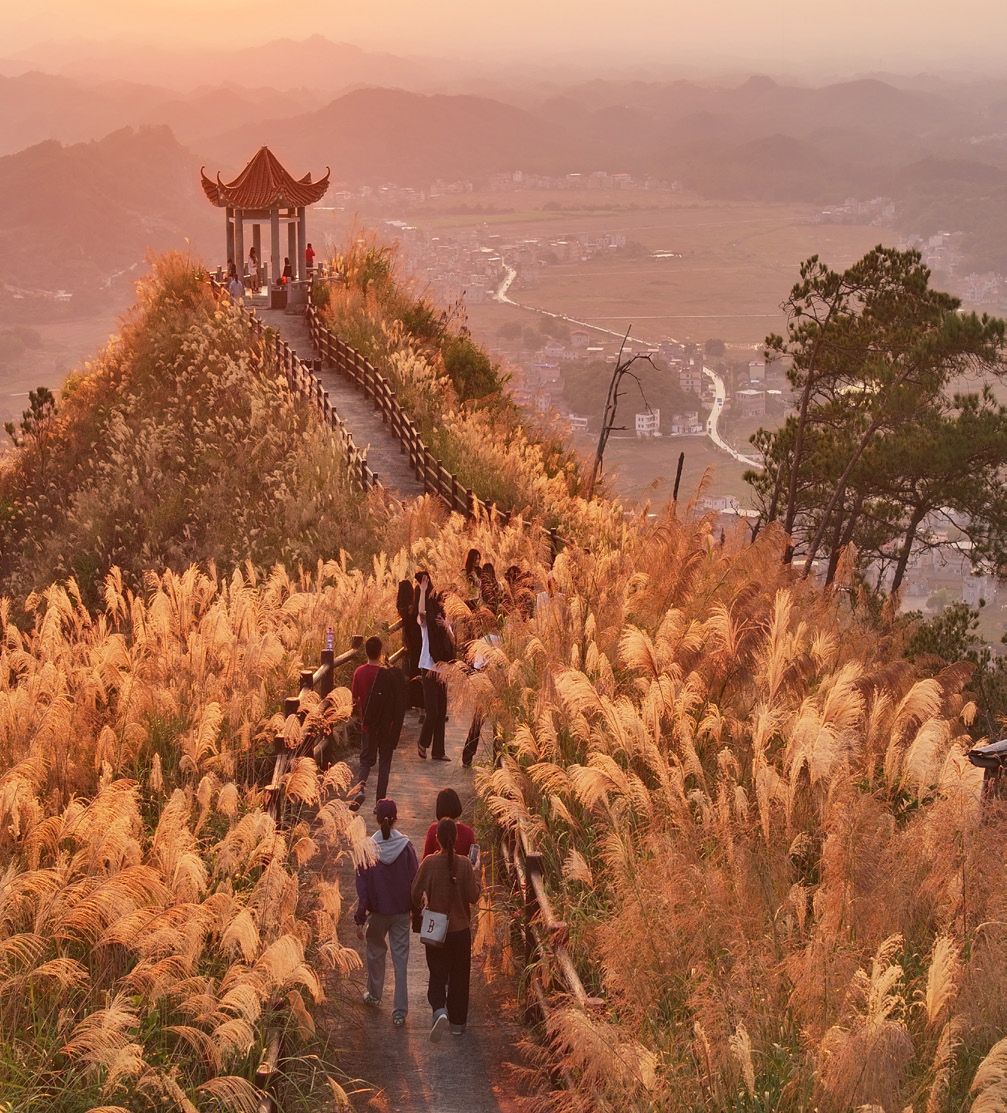 时值冬日,夕阳和煦。暖暖斜照着蒲塘镇北寮岭,一时间,晚霞满天,抚康凉亭在光影静立,成片的芒草花随风摇曳,泛起金色波澜。