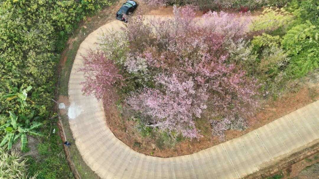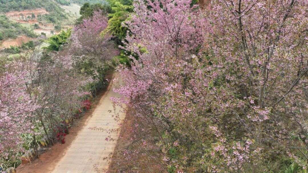冬日暖阳下,双江拉祜族佤族布朗族傣族自治县勐勐镇忙建村南利自然村的公路两旁,冬樱如云霞般漫卷,粉色花瓣随清风簌簌飘落,铺就出一条浪漫花径。暖阳穿枝拂叶,在整洁的村道上洒下斑驳光影,青山环抱中的村寨错落有致,鸟儿欢唱伴着清新花香,67户拉祜族群众聚居的家园,俨然一幅灵动秀美的田园画卷。
