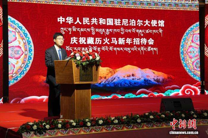 2026年2月7日,中国驻尼泊尔大使馆在尼首都加德满都举办藏历火马新年招待会,驻尼使馆临时代办周攀在招待会上致辞。中新社记者 崔楠 摄