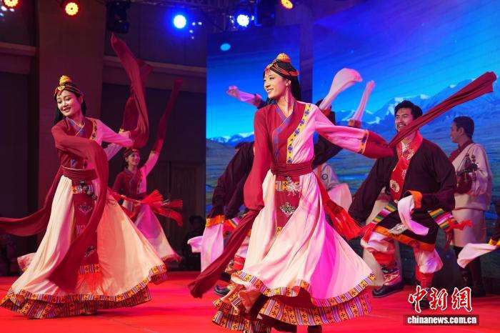 2026年2月7日,中国驻尼泊尔大使馆在加德满都举办藏历火马新年招待会,青海省果洛州民族歌舞团为旅尼藏胞带来精彩演出。中新社记者 崔楠 摄