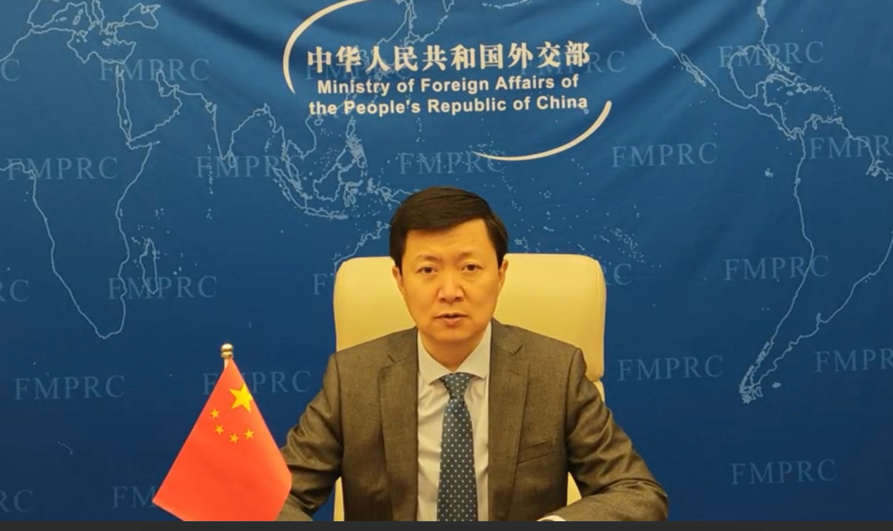中国外交部亚洲司参赞王德鑫作视频致辞。