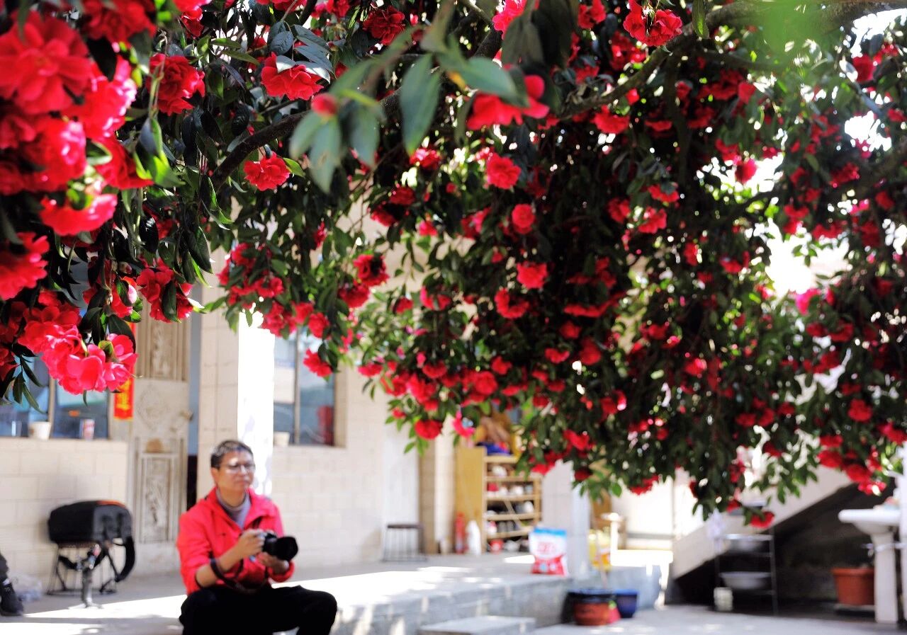 两株百年山茶花盖过屋头