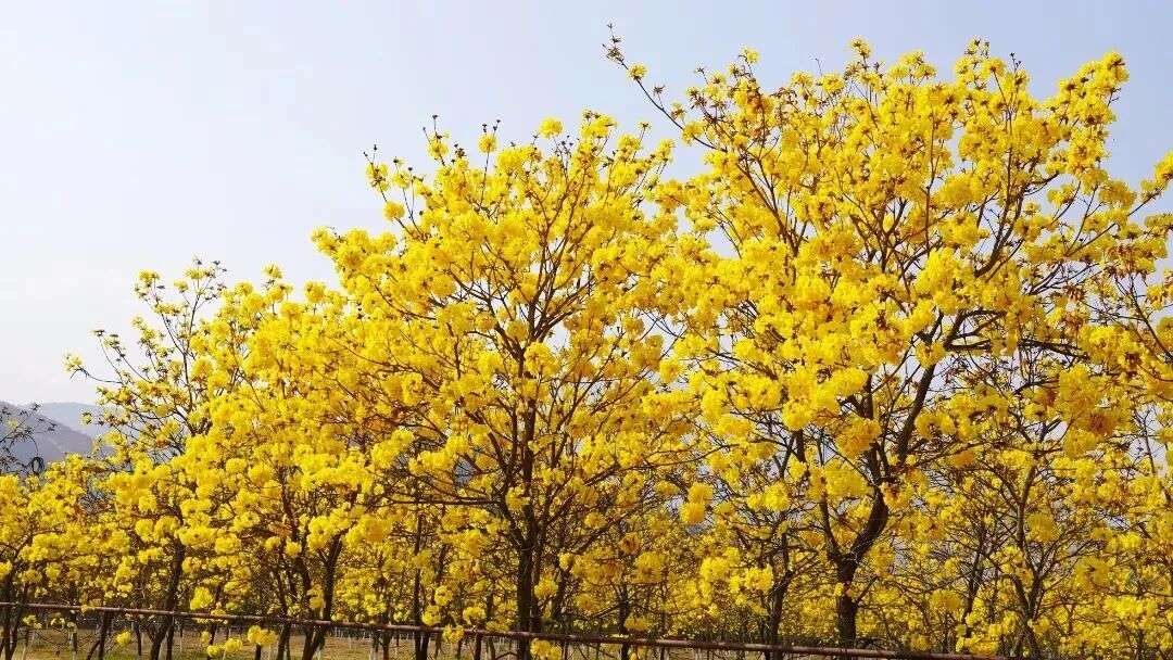 云县爱华镇忙费村,近百亩黄花风铃木迎来盛花期,满树金黄,迎风摇曳,如万千风铃轻唱春曲,成为春日里一道亮眼的风景线。