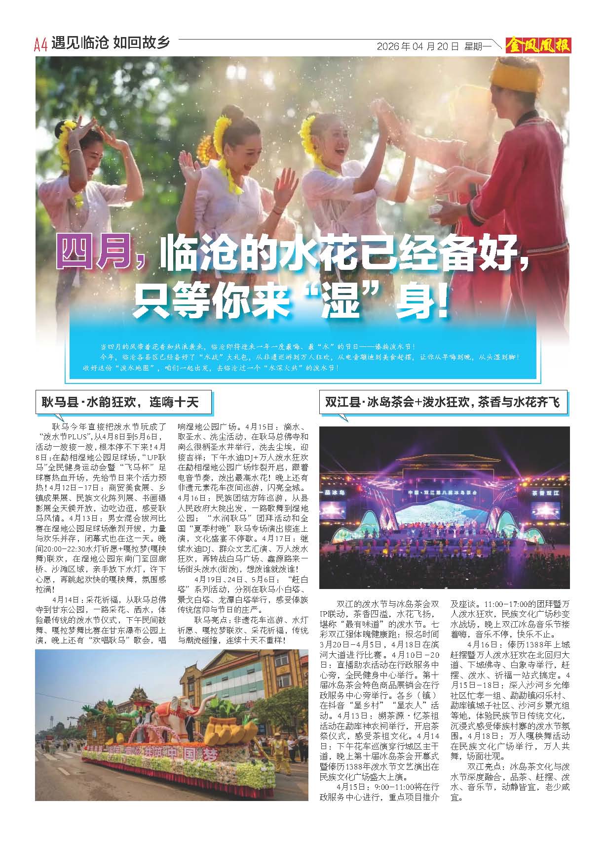 4月16日:民族团结方阵巡游,从县人民政府大院出发,一路歌舞到湿地公园;“水润耿马”团拜活动和全国“夏季村晚”耿马专场演出接连上演,文化盛宴不停歇。