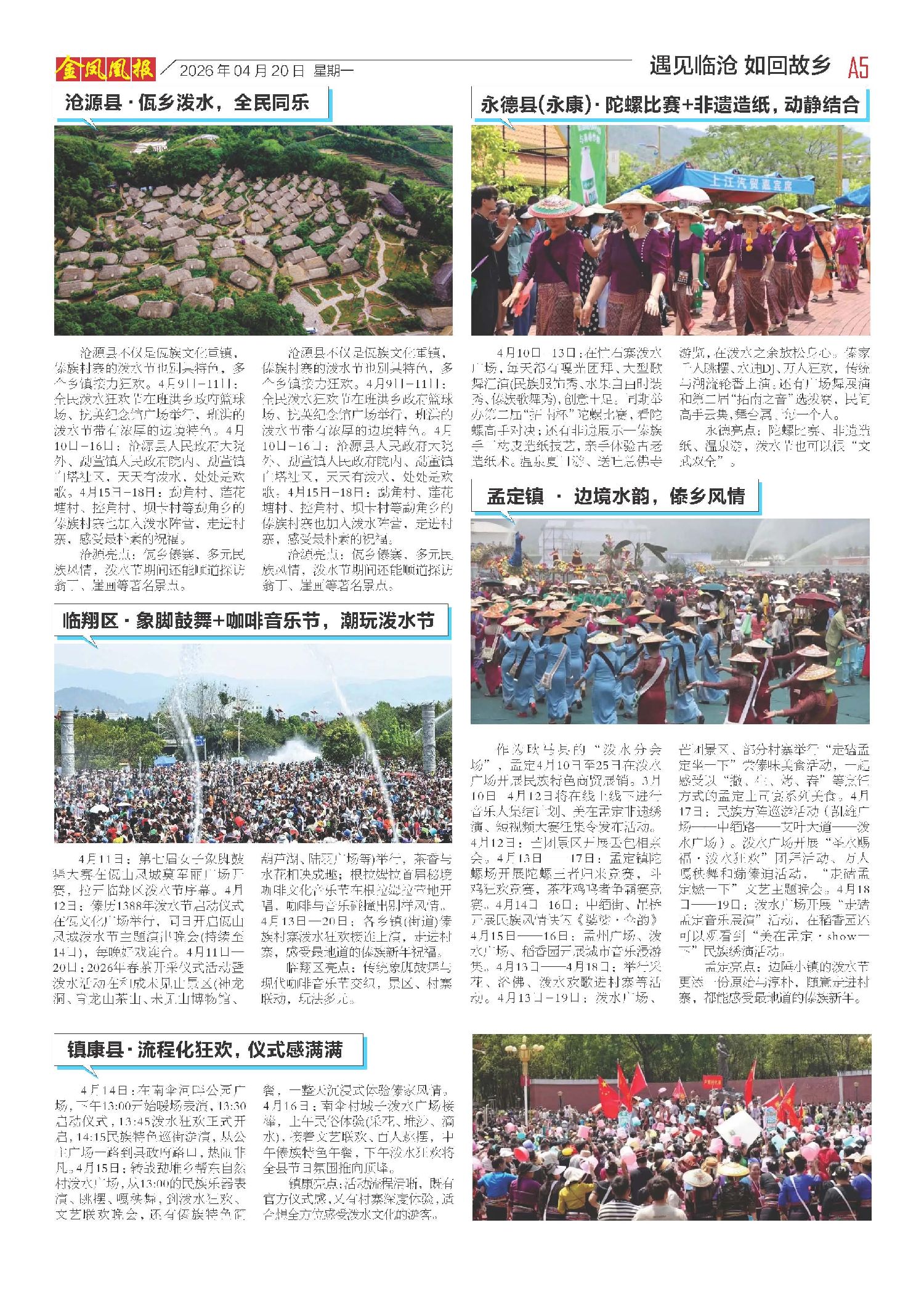 4月16日:南伞村城子泼水广场接棒,上午民俗体验(采花、堆沙、滴水),接着文艺联欢、百人跳摆,中午傣族特色午餐,下午泼水狂欢将全县节日氛围推向顶峰。