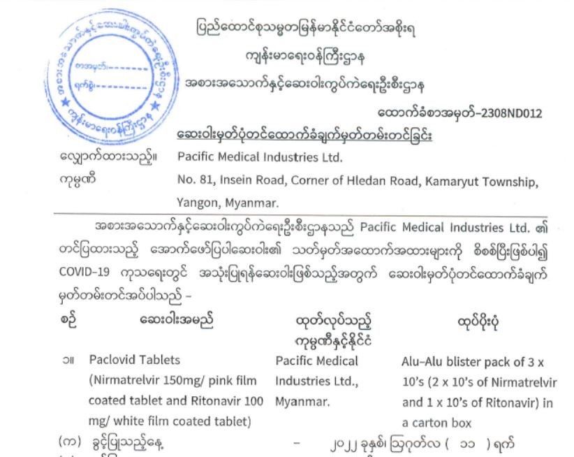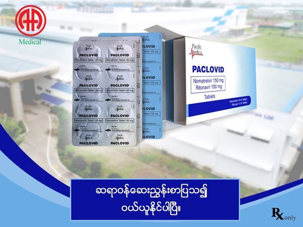 အဆိုပါ ကိုဗစ်ရောဂါကုသဆေး (သောက်ဆေး)အဖြစ် ကမ္ဘာ့ကျန်းမာရေး အဖွဲ့အစည်း (WHO)အပါအဝင် US FDA၊ UK MHRA၊ Korea FDA၊ Singapore FDA အစရှိသည့် ကမ္ဘာ့ဖွံ့ဖြိုးပြီးနိုင်ငံများ၏ ကျန်းမာရေးအဖွဲ့အစည်းများမှ ထောက်ခံထားသော PACLOVID (Nirmatrelvir150mg; Ritonavir100mg) သောက်ဆေးအား နိုင်ငံတကာ အဆင့်မီ အနောက်တိုင်းဆေးဝါး စက်ရုံ Pacific Medical Industries Ltdမှ branded generic“PACLOVID”အမည်ဖြင့် ထုတ်လုပ်အောင်မြင်ခဲ့ပြီး Myanmar FDAမှ ထောက်ခံစာအမှတ် (2308ND012)ဖြင့် ခွင့်ပြုချက် ရရှိပြီးဖြစ်ပါတယ်။