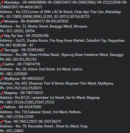 ရွှေမင်္ဂလာစျေးတွင် ဖွင့်လှစ်ထားသော ဆေးဆိုင်အမှတ် တ-၁၆၁နှင့် တ-၁၆၂၊ တတိယထပ်ရှိ AA Medical Products Ltd wholesale ဆိုင်ဖုန်းနံပါတ် 09-420151507၊ 09-421040995 သို့ဖြစ်စေ၊ ဗိုလ်ချုပ်စျေးသစ်တွင် ဖွင့်လှစ်ထားသော ဆေးဆိုင်အမှတ် (၄၂၃)Junction Cityဘေး၊ မြေညီထပ်ရှိAA Medical Products Ltd wholesale ဆိုင်09-795971138သို့ ဖြစ်စေ ဆက်သွယ်စုံစမ်း ဝယ်ယူနိုင်တယ်လို့ သိရှိရပါတယ်။ ထို့အပြင် နယ်ရုံးခွဲများသို့လည်း စတင်ပို့ဆောင်နေပြီ ဖြစ်ပြီး နယ်ရုံးခွဲ အသီးသီးသို့ လာမယ့်ရက်ပိုင်းအတွင်း ရောက်ရှိနိုင်မှာ ဖြစ်လို့ နယ်များမှ ကိုဗစ်ရောဂါကုသရေး ဆရာဝန်များ ဆေးရုံဆေးခန်းများ အနေဖြင့် ဖုန်းနံပါတ်များသို့ ဆက်သွယ်၍ ဆရာဝန်ဆေးညွှန်းစာ သို့မဟုတ် ဆေးရုံ/ဆေးခန်းမှ request letter ပေးပို့ပြီး ဝယ်ယူနိုင်မှာ ဖြစ်တယ်လို့ သိရှိရပါတယ်။