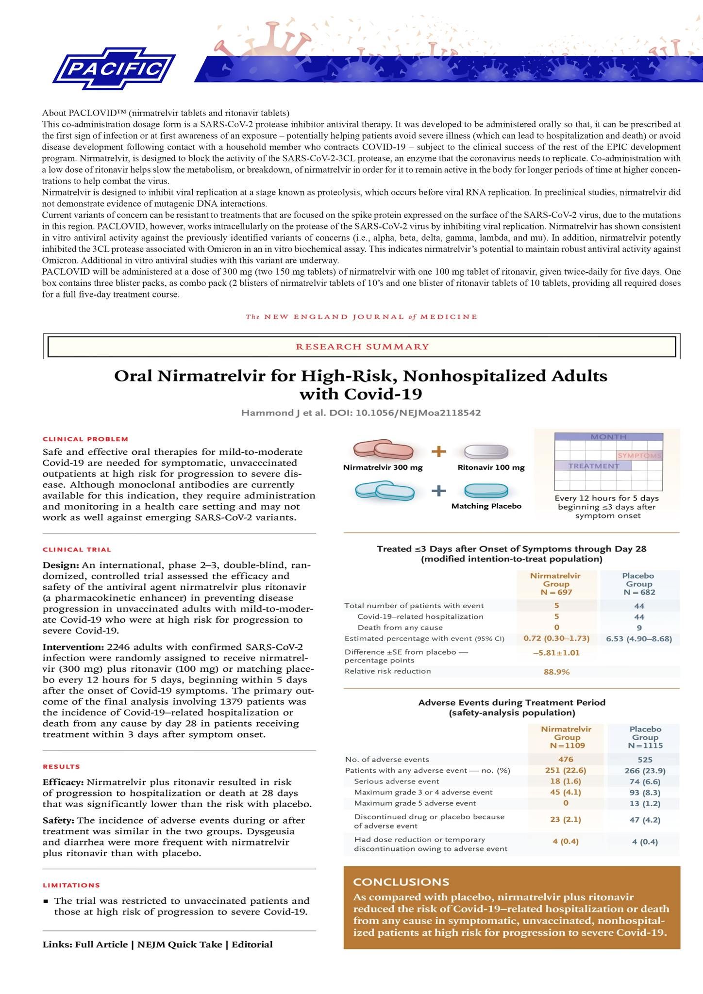 PACLOVID (Nirmatrelvir150mg; Ritonavir100mg) ဆေးသည် Covid-19 ရောဂါကြောင့် ဆေးရုံတက်ရသည့်နှုန်း လျော့နည်းစေခြင်း၊ သေဆုံးမှုနှုန်းအား ၉၀ရာခိုင်နှုန်းထိ လျော့ချပေးနိုင်ခြင်း၊ Deltaနှင့် Omicron မျိုးစိတ်များအား (ဓါတ်ခွဲစမ်းသပ်ချက်အရ) အောင်မြင်စွာကုသနိုင်ခြင်း၊ အသက်၁၂နှစ်အထက် ကိုယ်အလေးချိန် 40kgအထက် ကလေးများအား ကုသမှုပေးနိုင်ခြင်းစသည့် ကောင်းကျိုးများရှိသည့် နောက်ဆုံးပေါ် ကိုဗစ်ကုသဆေး (သောက်ဆေး) ဖြစ်တယ်လို့ ကုမ္ပဏီရဲ့ ထုတ်ပြန်ထားမှုတွေအရ သိရှိရပါတယ်။