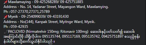 Pacific Medical Industries နောက်ဆုံးပေါ် ကိုဗစ်ရောဂါကုသဆေး PACLOVID (Nirmatrelvir150mg; Ritonavir100mg) (သောက်ဆေး) ဆေးတစ်ဘူး (၁၀လုံးကဒ်၃ကဒ်)ကို ကျပ်၂၅၀,၀၀၀ဖြင့် ရောင်းချပြီဖြစ်ကြောင်း အဆိုပါကုမ္ပဏီ လီမိတက်မှ ကြေညာလိုက်ပါတယ်။ အဆိုပါ ကုသဆေးကို စက်တင်ဘာ၁၄ရက်နေ့မှ စတင်၍ ဝယ်ယူနိုင်ပြီလို့ ကုမ္ပဏီဘက် အသိပေးကြေညာလိုက်တာဖြစ်ပြီး PACLOVID ကိုဗစ်ကုသဆေးအား ကိုဗစ်ကုသရေး ဆရာဝန်များ၊ ဆေးရုံဆေးခန်းများနှင့် ဆေးဆိုင်ကြီးများအနေဖြင့် ဆရာဝန်ဆေးညွှန်းစာ၊ ဆေးအမှာစာ request letter များဖြင့် ဝယ်ယူနိုင်တယ်လို့ ကြေညာထားပါတယ်။