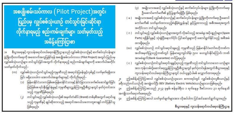 အစပျိုးစမ်းသပ်ကာလ (Pilot Project)အတွင်း လျှပ်စစ်ကား(EV)ကား တင်သွင်းမယ့် ကုမ္ပဏီအနေနဲ့ ကုမ္ပဏီများ ညွှန်ကြားမှုဦးစီးဌာန (DICA)မှာ မှတ်ပုံတင်ထားတဲ့ ကုမ္ပဏီဖြစ်ဖို့ လိုအပ်သလို ဗဟိုဘဏ်က အသိအမှတ်ပြုထားတဲ့ ဘဏ်မှာကျပ်သိန်း၅၀၀ တင်သွင်းနိုင်ကြောင်း ဘဏ်အာမခံချက် တင်ပြရမယ်လို့လည်း စီးပွားရေးနှင့် ကူးသန်းရောင်းဝယ်ရေး ဝန်ကြီးဌာနမှ ထုတ်ပြန်လိုက်ပါတယ်။