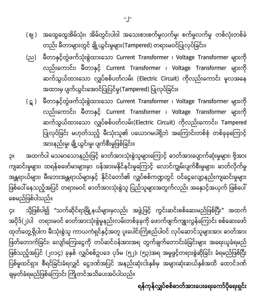 မီတာမရှိဘဲ တိုက်ရိုက်ခိုးယူခြင်း၊ မီတာရှိပြီး မီတာမတက်အောင် လုပ်ခြင်းနှင့် ဆင့်ပွားဓါတ်အား ဆက်သွယ်အသုံးပြုခြင်း အပါအဝင် လျှပ်စစ်ဓာတ်အားကို တရားမဝင်သုံးစွဲမှုများ တွေ့ရှိနေရလို့ ကွင်းဆင်းစစ်ဆေးကာ ဖော်ထုတ်တွေ့ရှိပါက ငွေဒဏ်အပြင် အများဆုံးထောင်၁၀နှစ် ပြစ်ဒဏ်အထိ ချမှတ်မယ်လို့ ရန်ကုန်လျှပ်စစ် ဓာတ်အားပေးရေး ကော်ပိုရေးရှင်းမှ ထုတ်ပြန်လိုက်ပါတယ်။