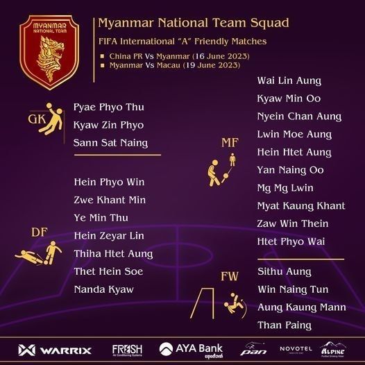 တရုတ်၊ မကာအိုလက်ရွေးစင်အသင်းတွေနဲ့ ကစားမယ့် ဖီဖာနိုင်ငံတကာ ခြေစမ်းပွဲတွေအတွက် ကစားသမား၂၄ဦး ပါဝင်တဲ့ မြန်မာ့လက်ရွေးစင် ဘောလုံးအသင်းအပြီးသတ် လူစာရင်းကို ထုတ်ပြန်လိုက်ပြီး ပြည်တွင်း၊ ပြည်ပကလပ်အသင်းတွေ ခြေစွမ်းပြကစားနေတဲ့ ကစားသမားတွေ ပါဝင်လာပါတယ်။