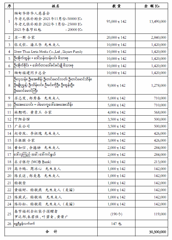 缅甸华侨华人慈善会携手缅华各团体及个人爱心人士向年满75周岁以上的142位老人送上春节红包和祝福,每人拿到212,500缅元红包及礼品,红包总额达30,300,000缅元。