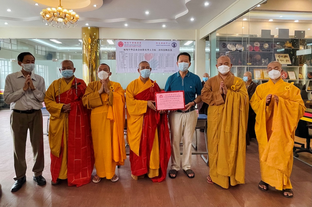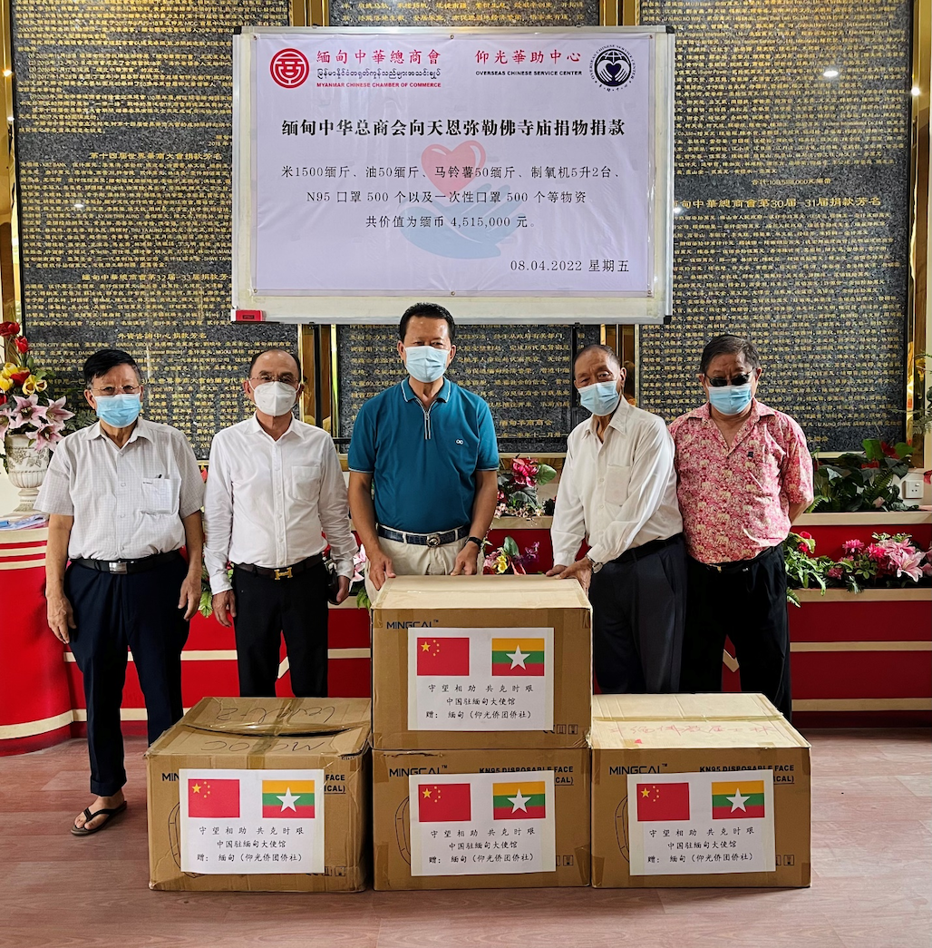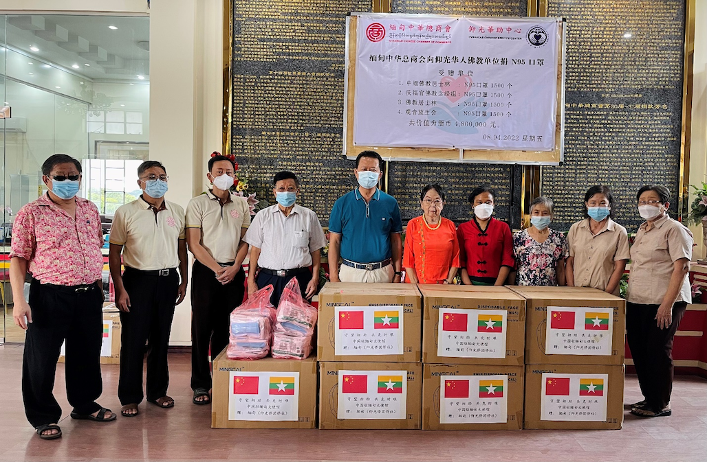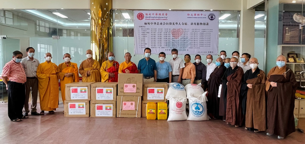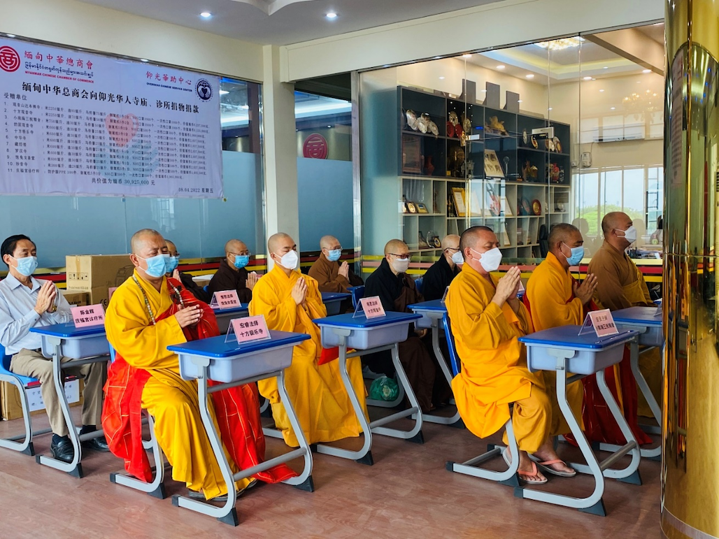 2022年4月8日上午,缅甸中华总商会、华助中心再次向十六家仰光华人寺庙、诊所无偿捐物捐款。捐赠仪式在缅甸中华总商会举行,隆重邀请寺庙法师代表、诊所代表出席受赠。缅甸中华总商会会长林文猛及常务副会长苏汝波,副会长尤泽富、叶孙明、何其林、周炳昌、杨胜富,名誉会长李福泉,秘书林长仁,总务黄泉祥等一行人代表商会及华助中心捐赠共计47,040,000缅元物资以及向仰光机场捐赠N95口罩10000个助力抗疫。捐赠仪式上,观音山达本禅寺从法法师带领各寺院的法师共同为此次捐赠诵经回向,并为众生祈福求平安。