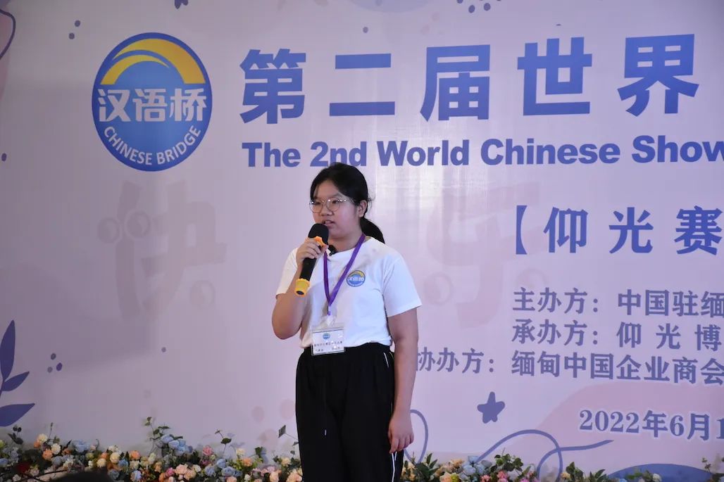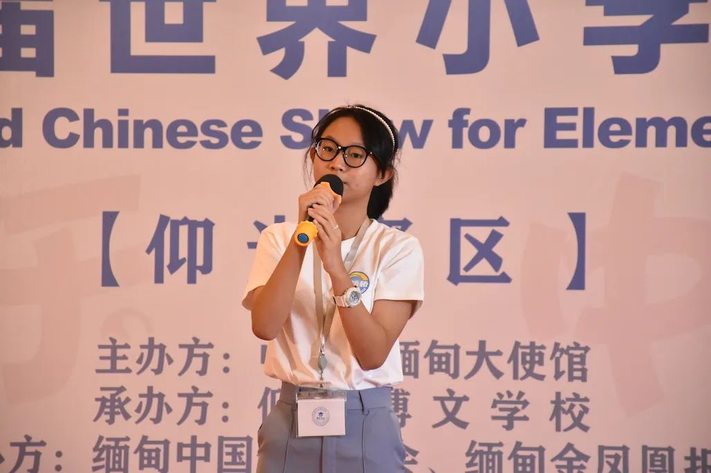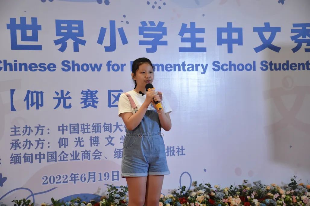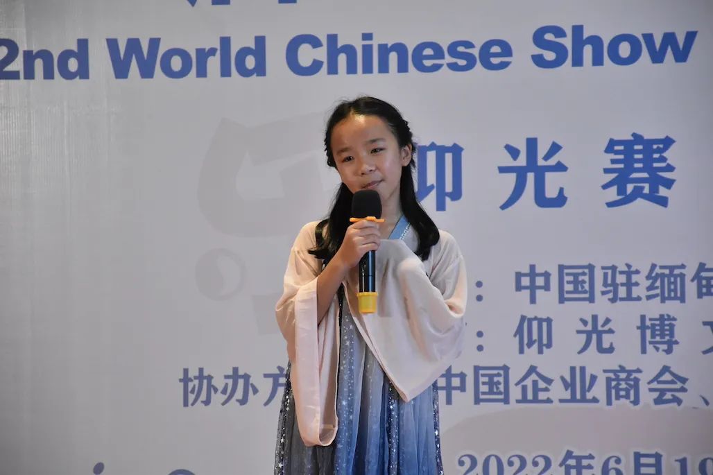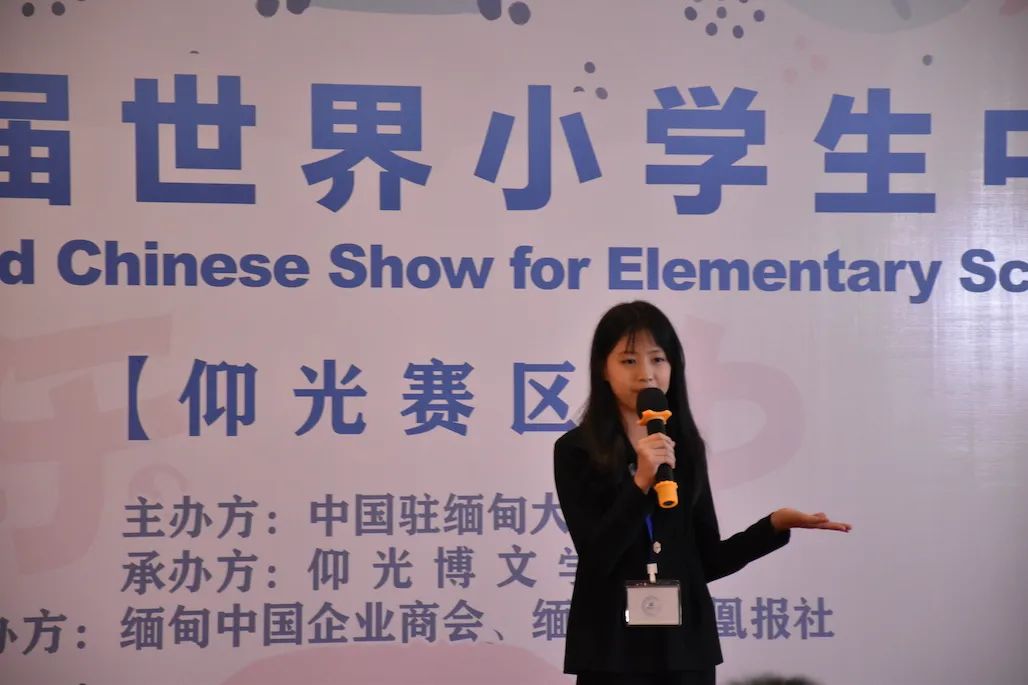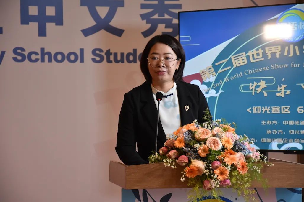 中国驻缅甸大使馆文化处秘书黄珊珊代表潘峰文化参赞致辞,表示汉语为桥,梦想为马,汉语是沟通你我的桥梁。今年(2022年),汉语桥世界小学生中文秀首次落地缅甸,实属不易。