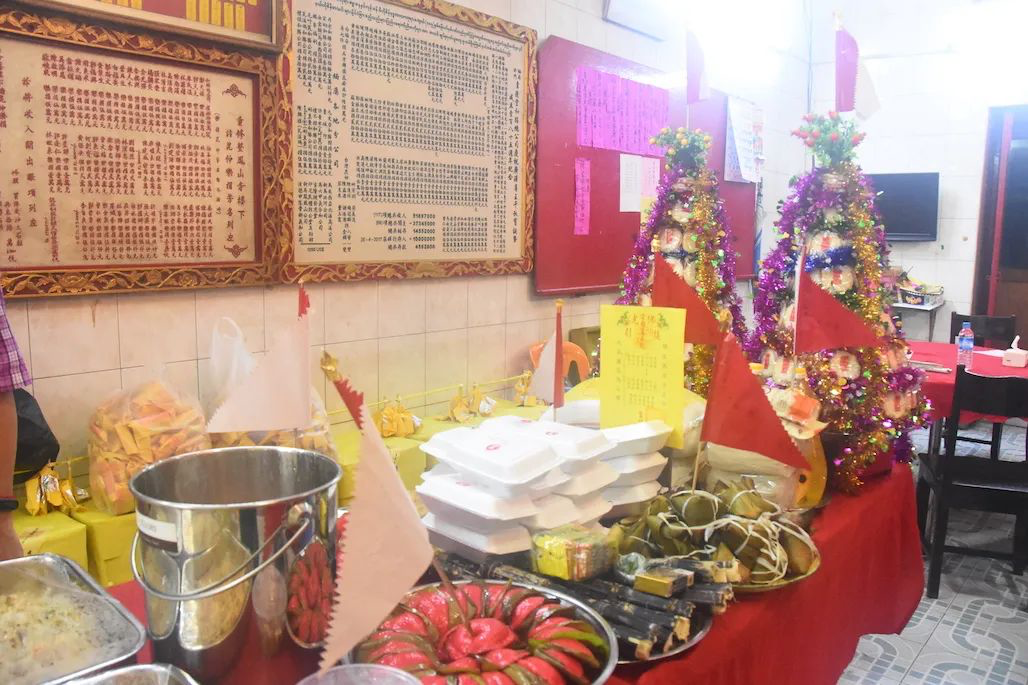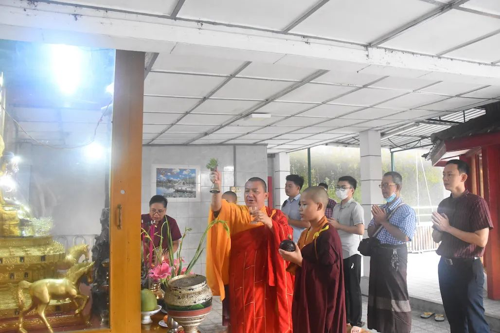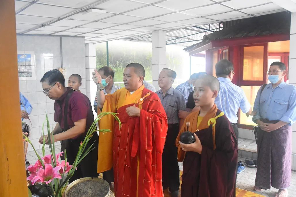仰光凤山寺的供台上,依律分别摆有各类祭祀礼品。在祭祀仪式上,总堂正堂高汉德和昆仲们跟随小南海三祝精舍法师们进行烧香点烛祈福,敬献祭品。祭祀仪式后,缅甸洪门青莲堂和胜总公司宣读了上述离世义兄及义嫂的荣退文疏。
