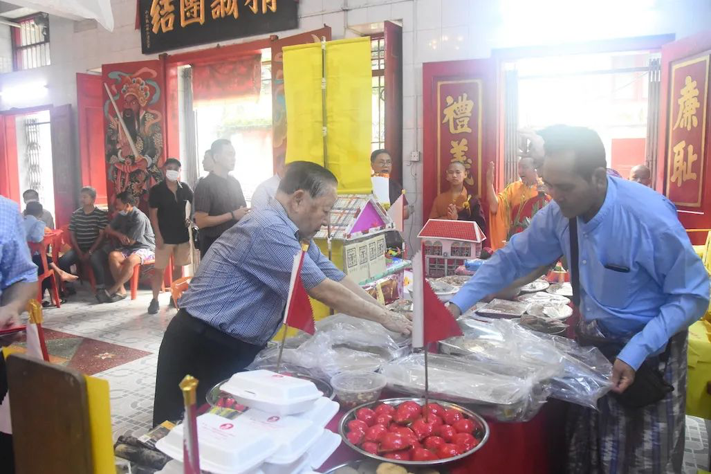 【本报记者胡安娜仰光报道】8月21日上午9时,缅甸洪门青莲堂和胜总公司在仰光凤山寺举行中元节祭祀仪式。该总堂正堂高汉德,副正堂白福安、黄泉祥,内总理曾国华等昆仲们怀着无比沉重的心情为离世的总堂义兄及义嫂举行中元节祭祀仪式,祈求逝者灵魂得到安息,往生极乐。