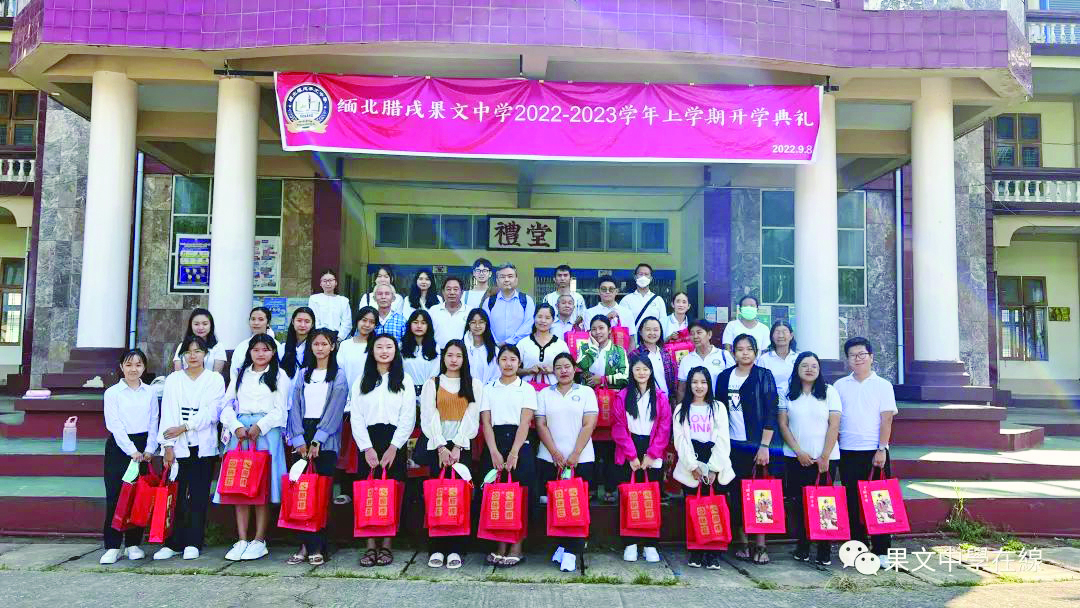 【本报讯】9月8日早上7时,腊戌果文中学采取实体主会场同步连线云端分会场直播模式进行,主会场设在果文中学教学楼一楼礼堂前,分别由本土教师李好老师(中文)、李家润老师(缅文)、曹明瑞老师(英文)三语主持;分会场设在空中云端举行,由教务处副主任、中国教师王含笑老师和宋亚萍助理主持。魏开智董事长、李绍清监事长、腊戌果文校友会楊文权会长、楊治平常務副董事长、何忠強副校长、楊世成副董事长、趙仁發副董事长、央振禮常務副会长、段胜中秘書长、李義元副财政长、龚永胜康乐组长、周廷富董事等,到校指导开学典礼,校长助理楊圯琥老师、部门主任和初中小学幼稚园全体实体课师生参加了开学典礼,高中部优秀学生(班级前三名)到校参加开学典礼并接受颁奖。卢勇欣校长和全体网课师生在线参加了开学典礼。