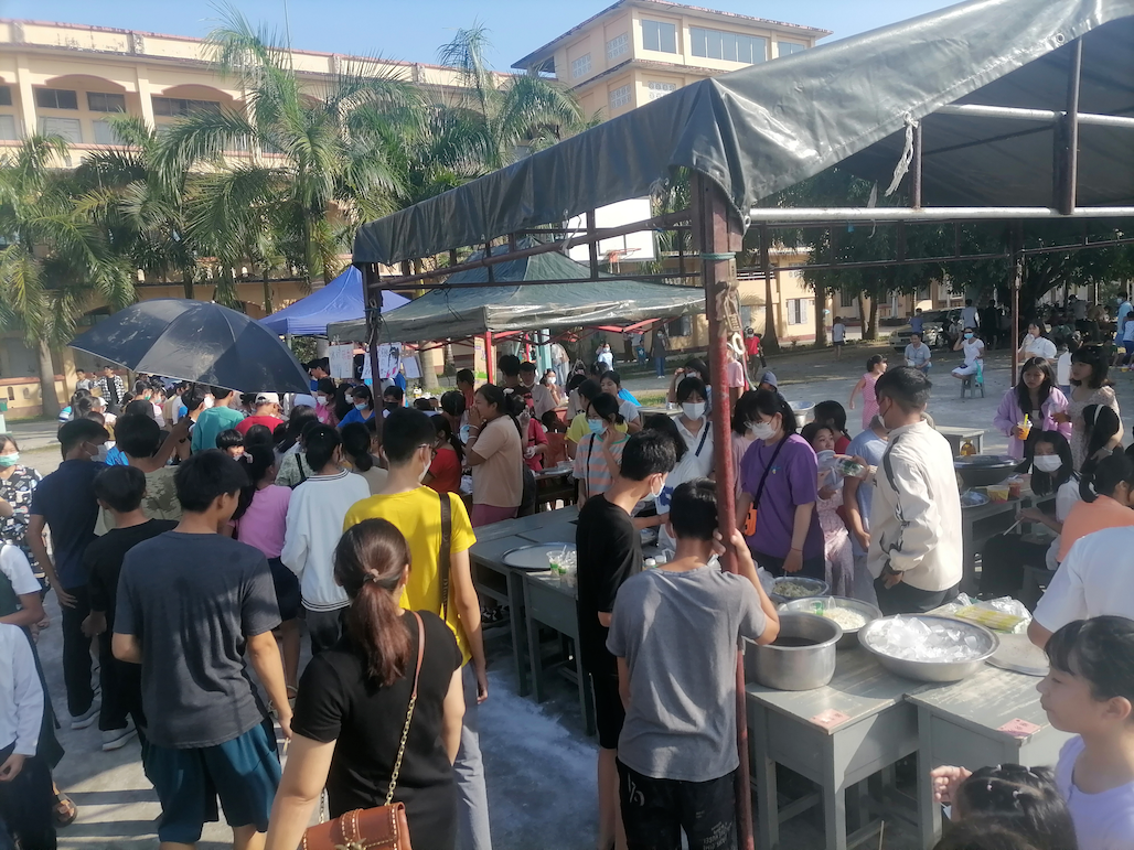 早上8点,在操场的班级美食街现场和综合活动中心歌舞现场,人头攒动,热闹非凡,处处满是节日的欢乐气氛。班级摊位上摆满了各种各样的菜肴,主要以炸、炒、凉拌和冷饮为主,川流不息的人群手中拿着各种小吃,沉浸在美食的享受中,欢快的气氛弥漫了整个校园。