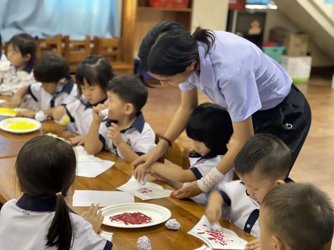 幼稚园全体教师用半个月时间仔细推敲教案,反复修改课件,精心准备教具,只为给师生们呈现最好的课堂体验。第一节课是小班美术活动,由林晓娟老师呈现,参赛课题是《盛开的山茶花》。美术主要培养幼儿想象力、创造能力和艺术感受能力为核心,这种能力的培养需要教师引导幼儿观察和感受艺术作品的造型、色彩、构图,观察周围环境、事物的结构,使幼儿对美术创作活动产生更大的兴趣,从而更进一步的促进幼儿的创造能力和想象力发展。林小娟老师以让孩子观察花朵引入课题,激发幼儿对美术的兴趣,在孩子观察完课件上呈现的花朵后,老师把提前准备好的原料教给孩子,孩子自己动手制作印花小裙子。本堂课老师对上课节奏的把握准确,动静结合,孩子专注力和课程参与感强,教学效果良好。