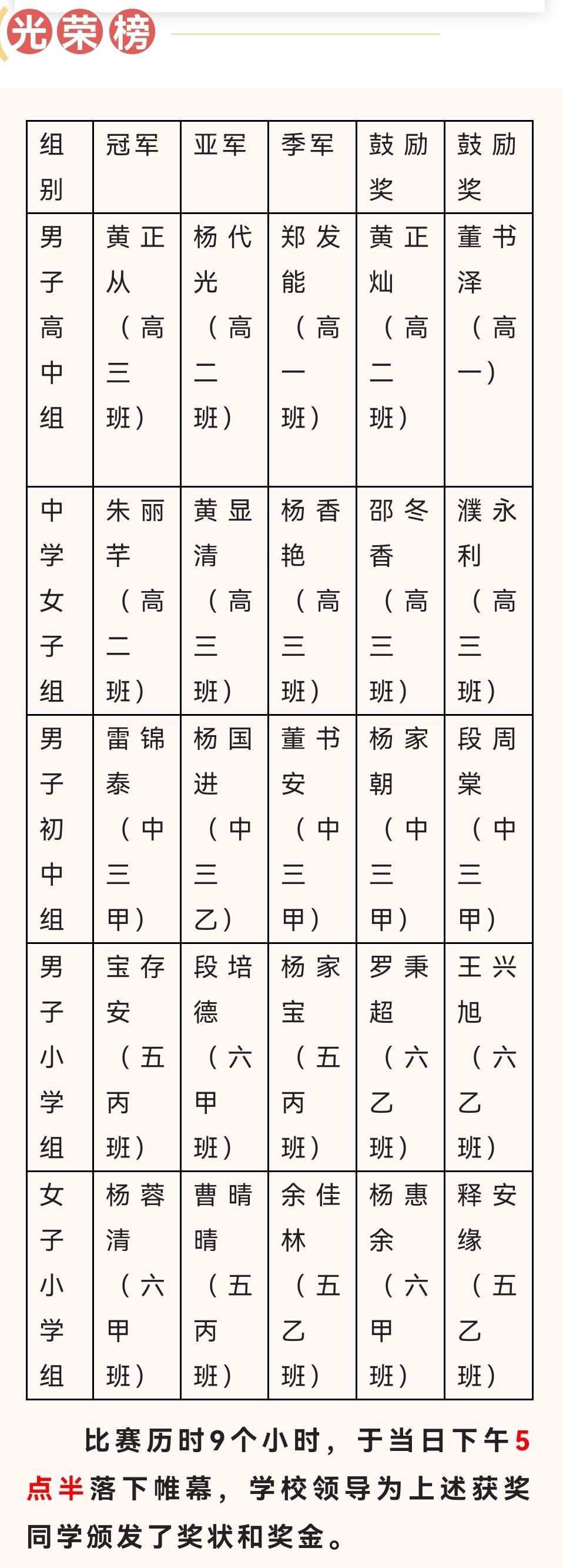 本次比赛共有四年级以上18个班级115名运动员参赛,比赛总人数创黑猛龙中学校内同项目比赛历史之最。