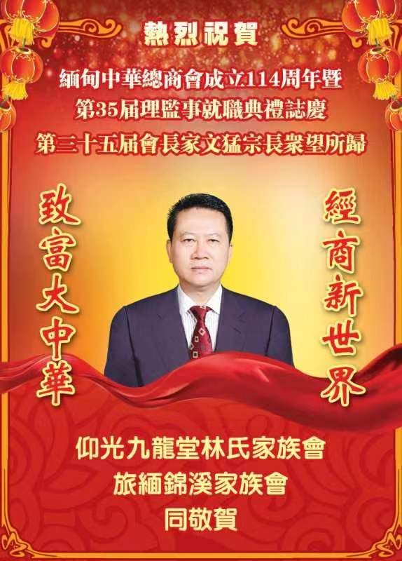 仰光九龙堂林氏家族会、旅缅锦溪家族会祝贺缅甸中华总商会第三十五届会长家文猛宗长众望所归