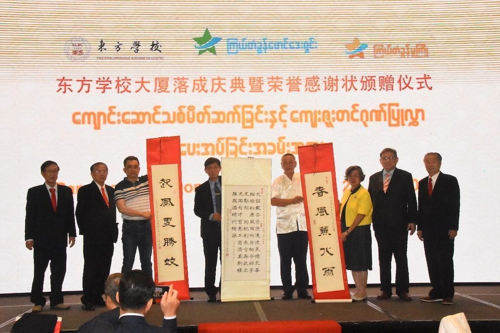 仪式上,曼德勒孔教学校董事会、缅北果文文教会、东吁建德慈爱幼儿园、缅甸国际教育中心、缅华书画协会等缅华社团向东方学校赠送贺诗、贺联和贺匾。