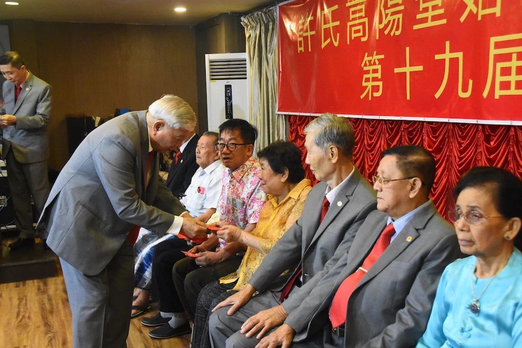 许氏高阳堂会长许智民上台向75岁以上的13位宗亲寿星们赠送红包以表敬意。接着,许智民会长又向两位宗亲子女颁发奖金,以资鼓励。
