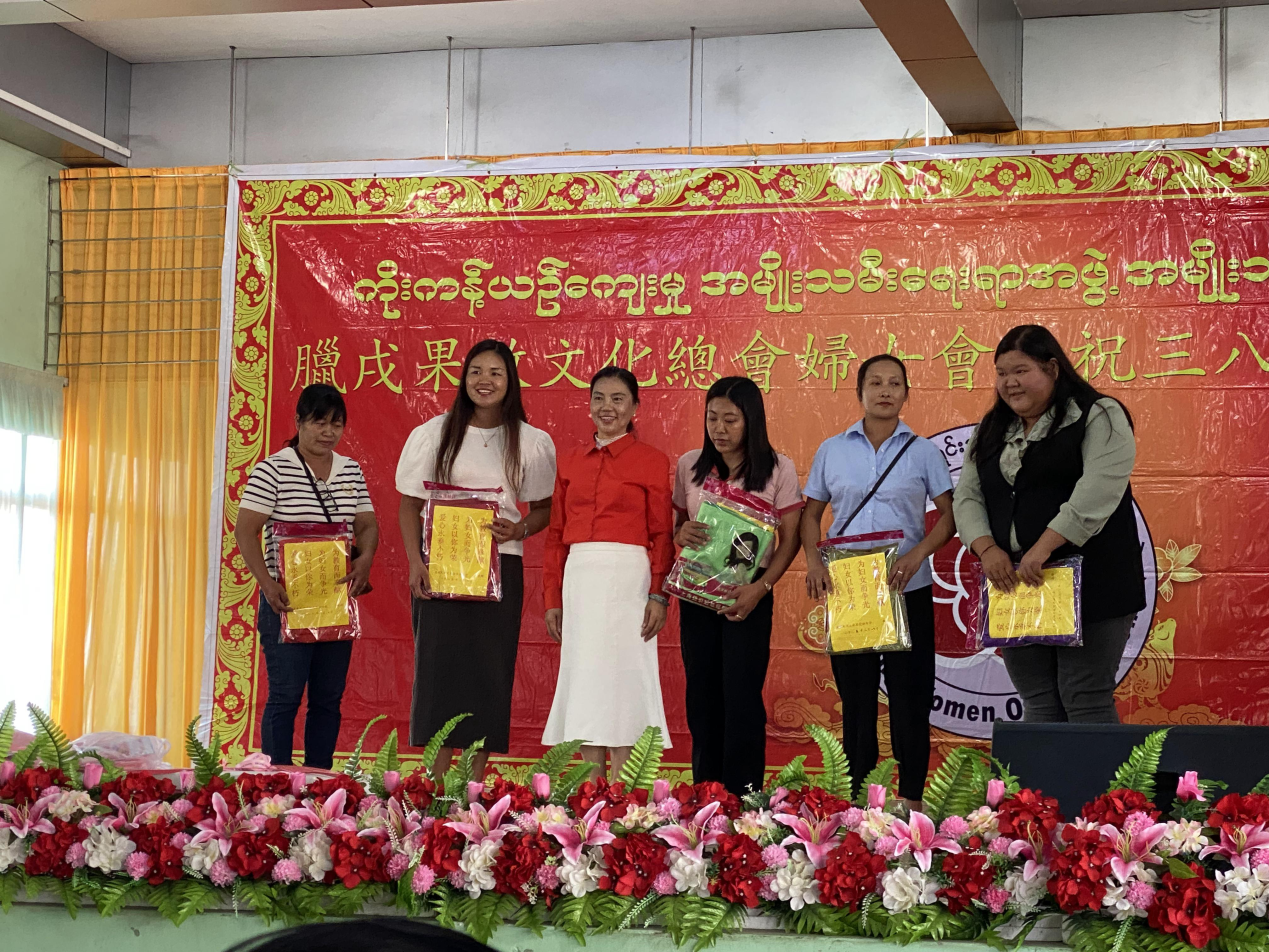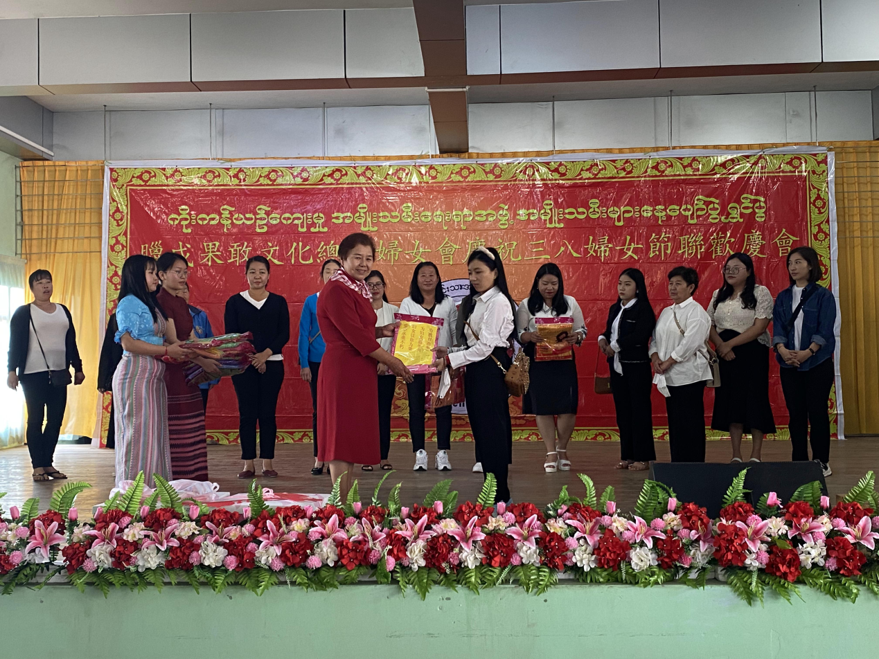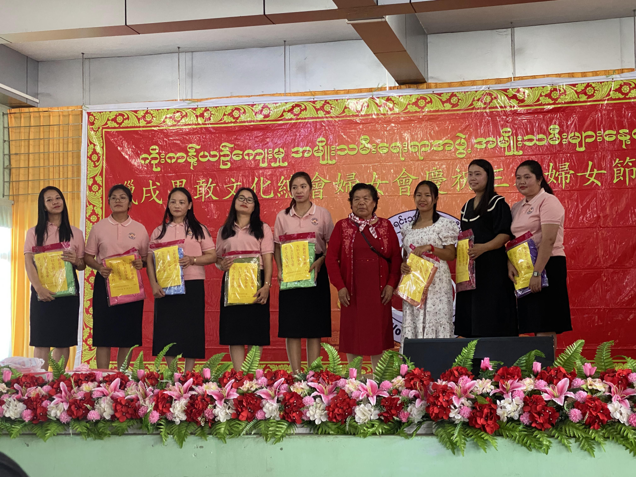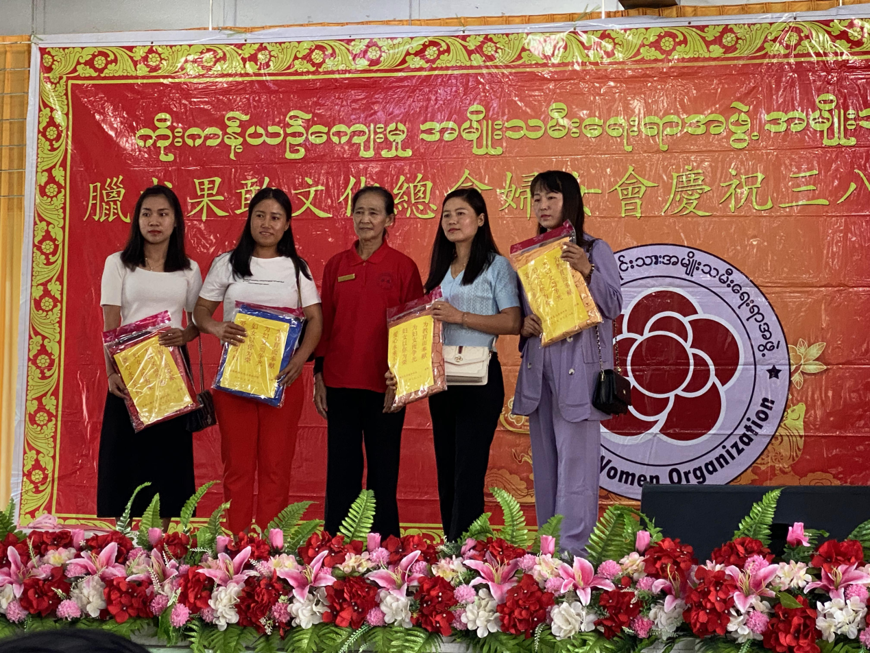 领导致辞后,妇女会吴春焕主席、罗桂花副主席,果敢民族团结党罗静副主席、云南同乡会妇女组彭国美会长、各分会代表等分别为腊戌华校教龄满5年以上的女教师们,赠送了节日慰问品,包括果文中学、圣光中学、明德中学、黑猛龙中学、果民学校、果邦学校、果强学校、果荣学校、双龙学校、圣恩学校、果联学校、曙光学校、果宣学校、金星学校等学校的近200名女教师们受邀请上台,接受妇女会慰问和鼓励。