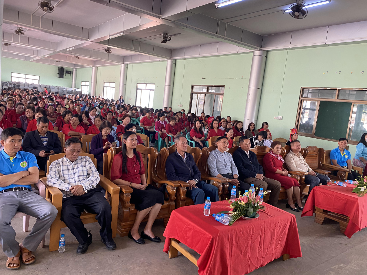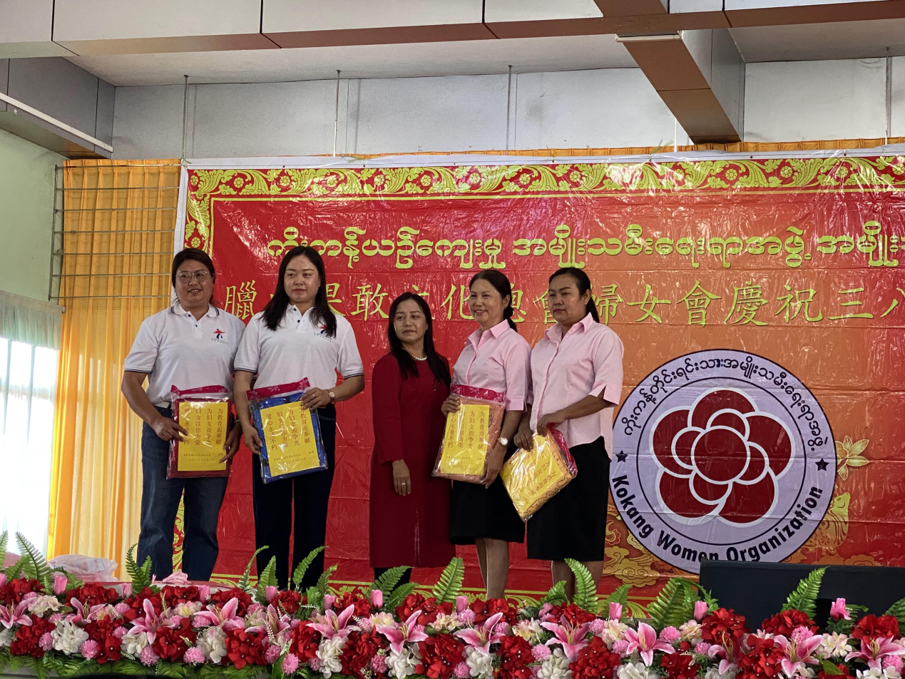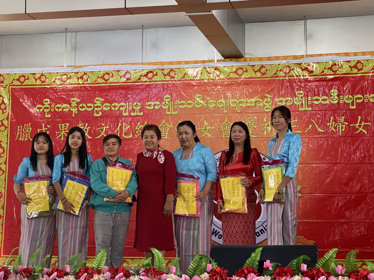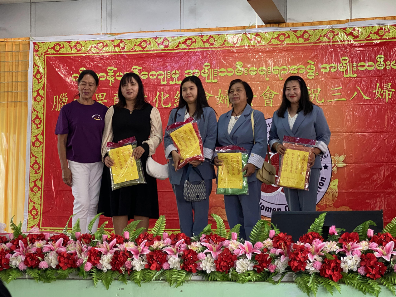 领导致辞后,妇女会吴春焕主席、罗桂花副主席,果敢民族团结党罗静副主席、云南同乡会妇女组彭国美会长、各分会代表等分别为腊戌华校教龄满5年以上的女教师们,赠送了节日慰问品,包括果文中学、圣光中学、明德中学、黑猛龙中学、果民学校、果邦学校、果强学校、果荣学校、双龙学校、圣恩学校、果联学校、曙光学校、果宣学校、金星学校等学校的近200名女教师们受邀请上台,接受妇女会慰问和鼓励。