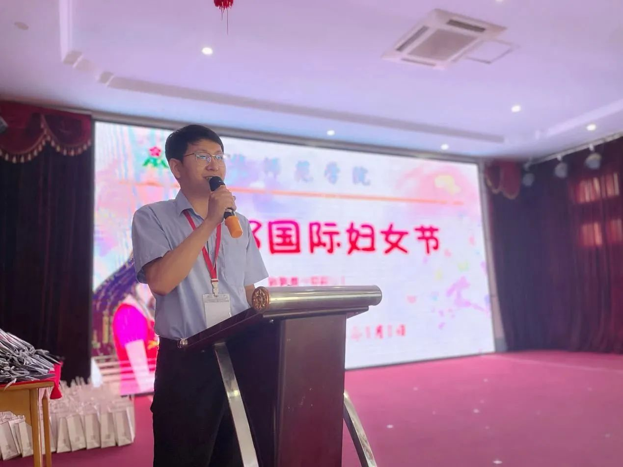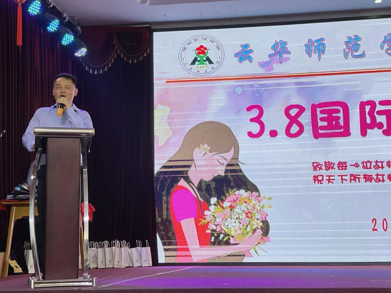 活动正式开始,主持人杨会雄老师热情洋溢地介绍参加活动的教师们,紧接着杨周院长上台致辞。杨院长首先向全体教师转达了云华师范学院董事会蒋恩悌董事长及校董事会对全体女教师的慰问与祝福。其次代表学院全体男教师对全体女教师表达了敬意和最真挚的祝福。杨院长慷慨寄语道:“愿春风十里,芳华如你。祝各位女教师兰芝繁茂、桃李芬芳,柔肩担重任,巾帼绽芳华!”