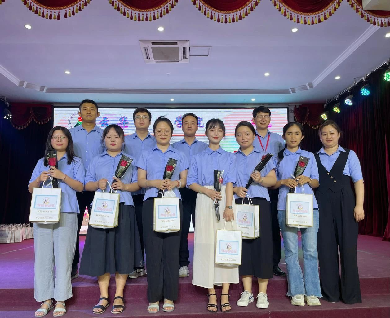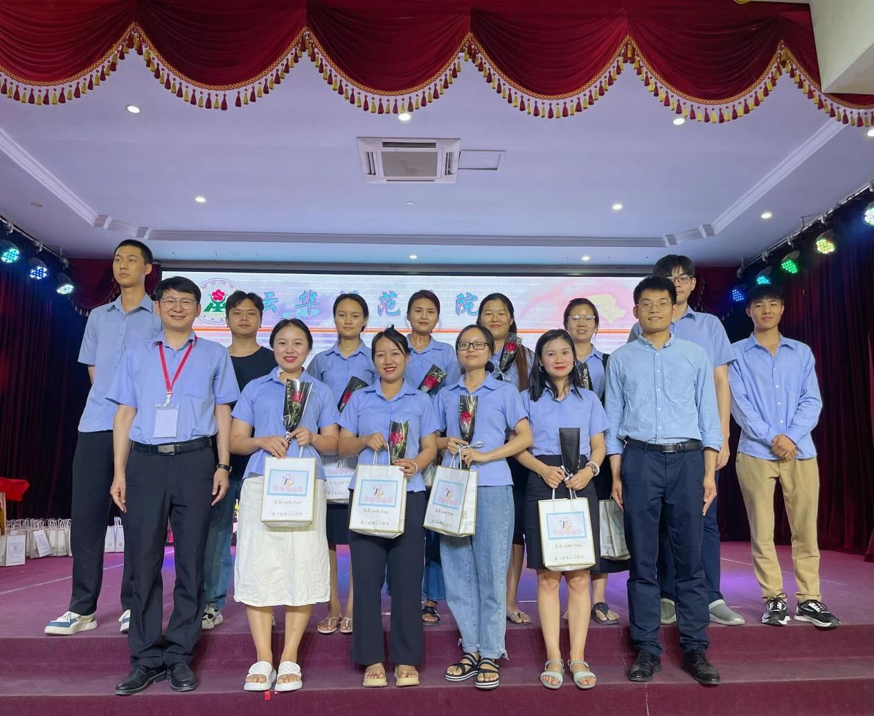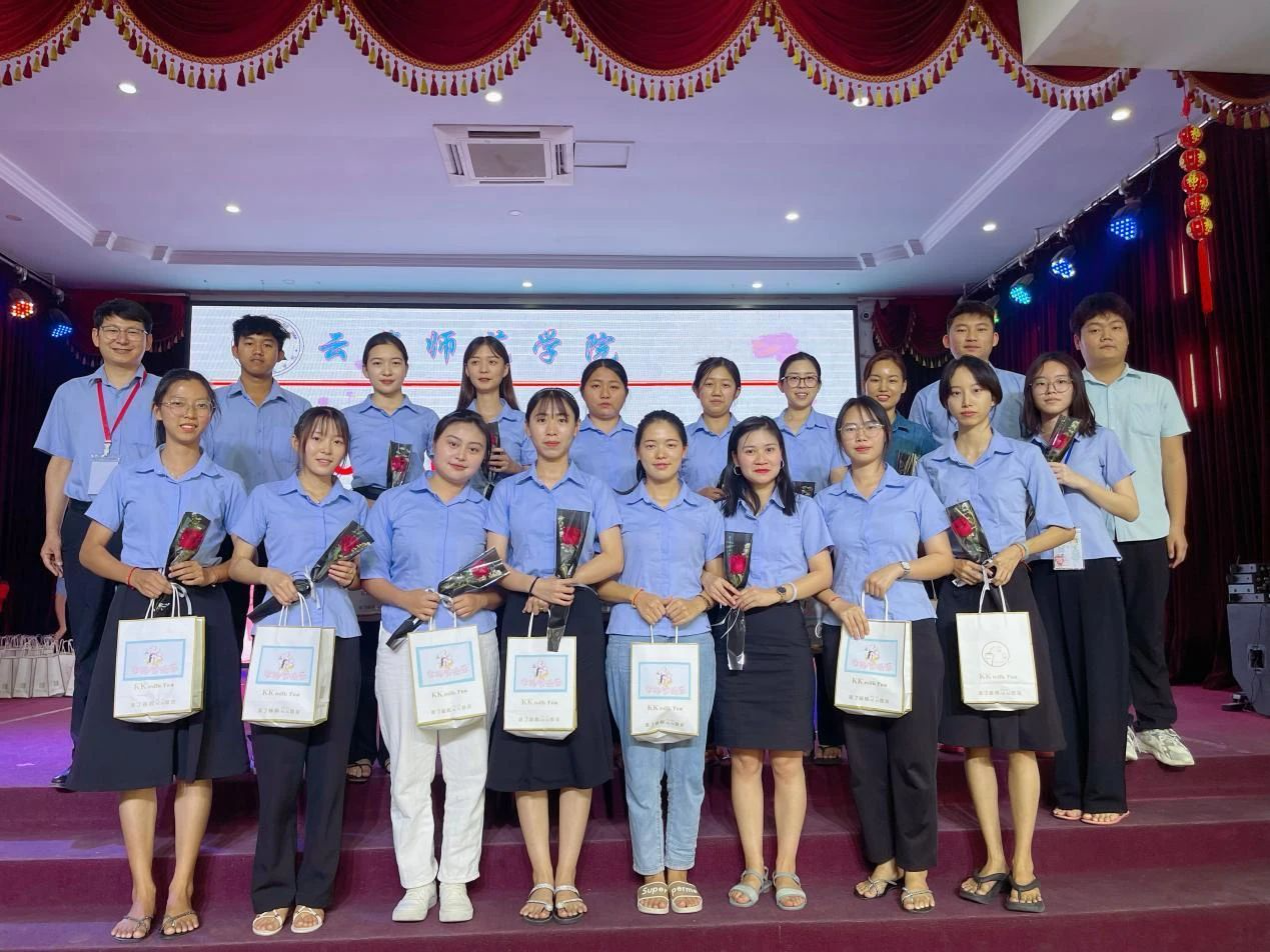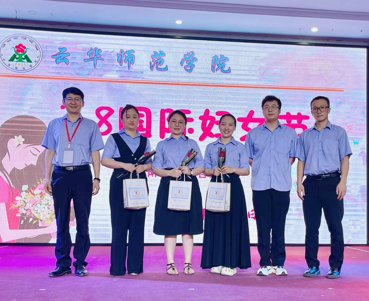 紧接着上台的她们是为云华教育事业呕心沥血,做出突出贡献的骨干教师:刘莹老师、段富琴老师、李冰冰老师。由杨周院长、师范部丁浩主任和中学部副主任韩兴为她们送上节日的祝福。