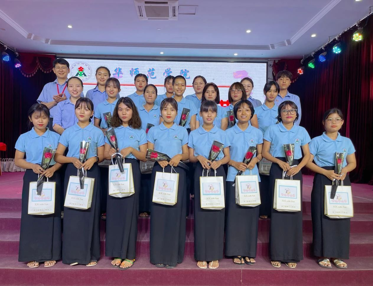 其后依次上台的是学院全日制缅文部的四位缅语女教师,小学部全体女教师,中学部全体女教师和幼稚园的女教师们及女保育教师们。杨周代理院长,各部门主任以及各部门的男教师们分别上台为各部门的女老师们送上了慰问和祝福。